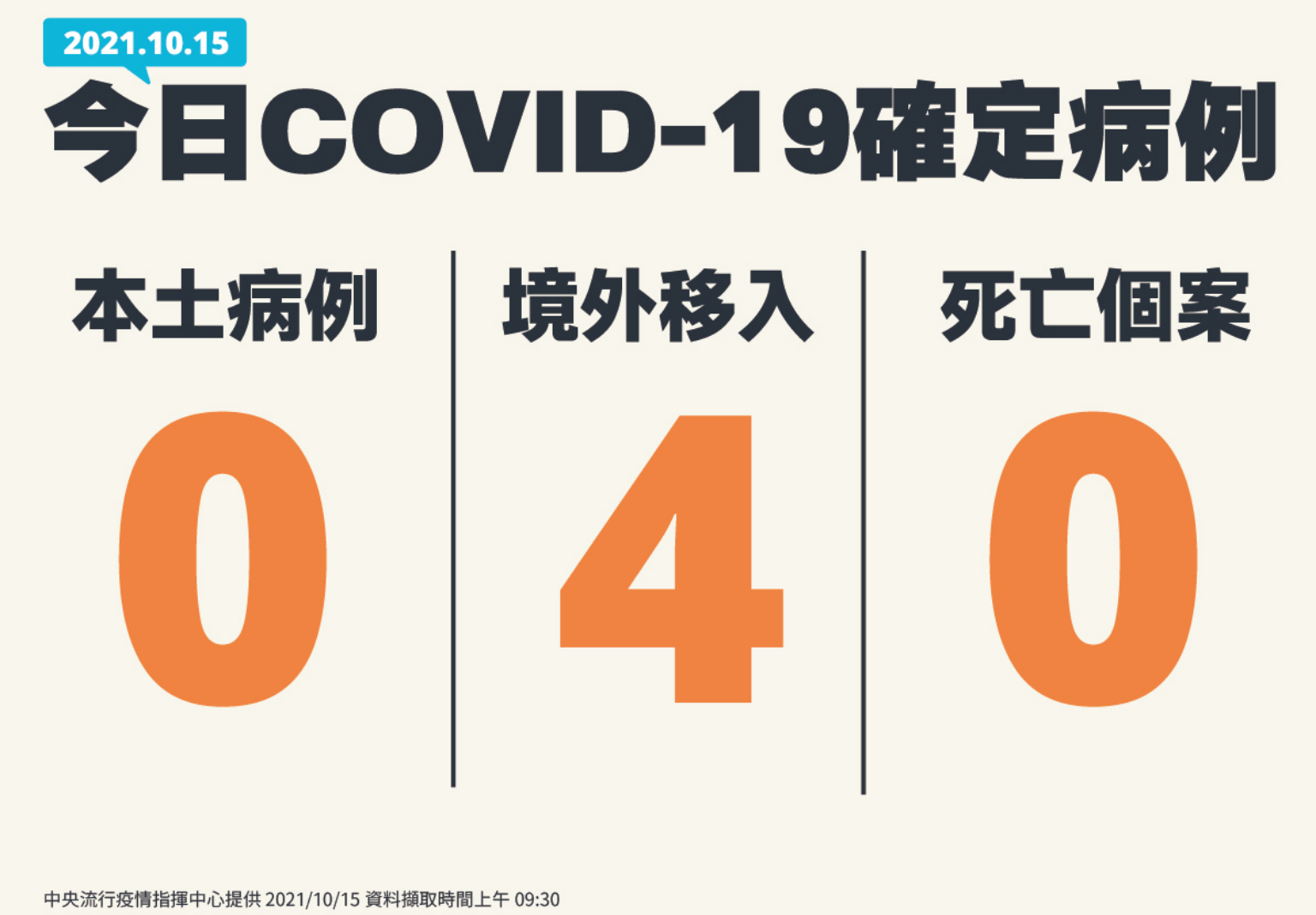 指揮中心說明,今日新增4例境外移入個案,為1例男性、3例女性,年齡介於10多歲至30多歲,分別自印尼(案16432)、美國(案16433)、菲律賓(案16434)、蒙古(案16435)入境,入境日介於今(2021)年10月1日至10月13日,皆持有搭機前3日內檢驗陰性報告;詳如新聞稿附件。