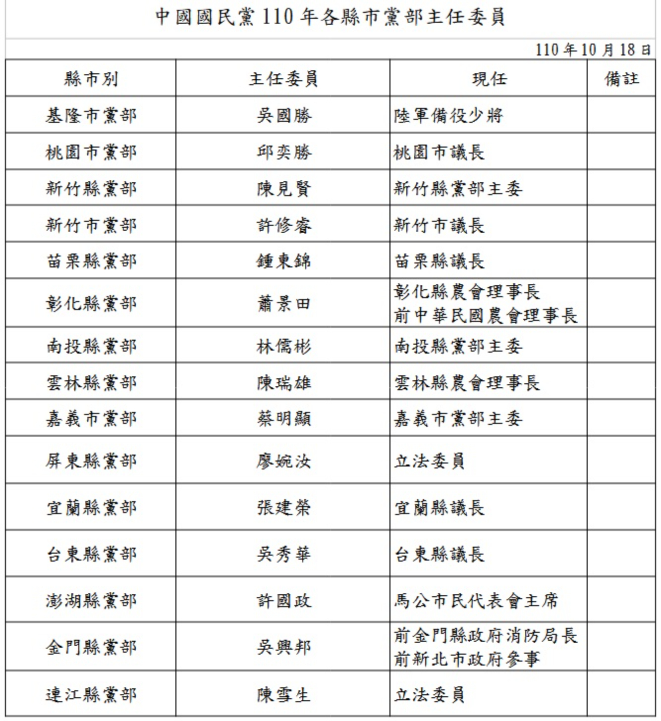 如前所述,目前尚有多個地方黨部主委人事還沒公布,包括台北市、新北市、台中市、台南市、嘉義縣、花蓮縣等6縣市。至於高雄市則是早就事先公布由許福明回鍋,並已在上週舉行布達典禮。