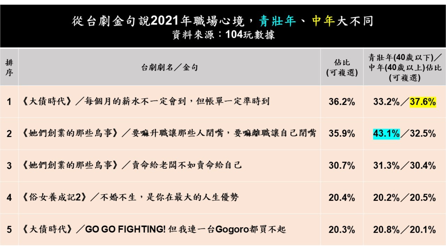「台劇金句」票選結果以薪資壓力居首,中年族群更重薪水,青壯年重環境。(圖/104玩數據提供)