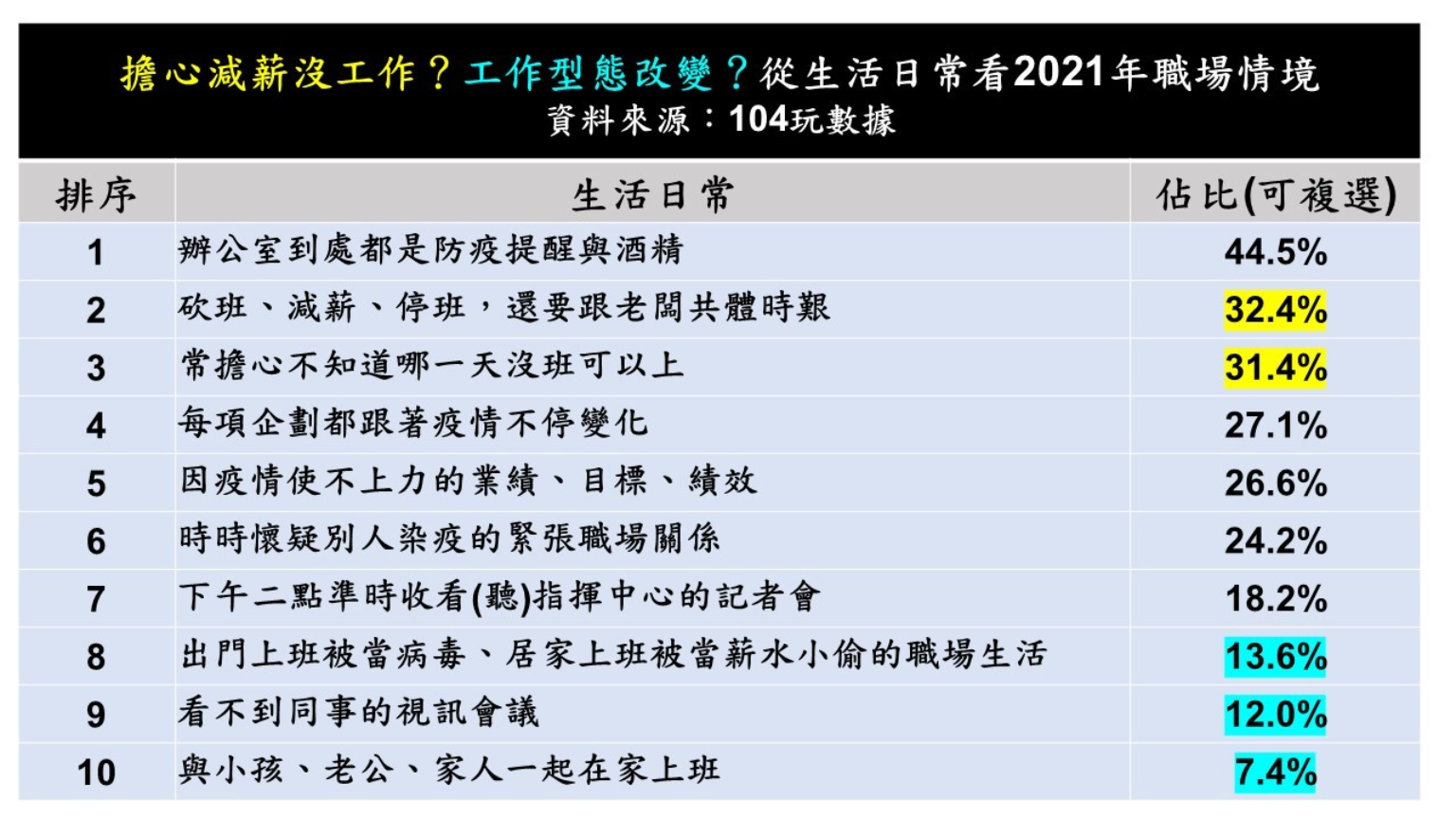 104玩數據調查,44.5%受訪者認為「辦公室到處都是防疫提醒與酒精」最能代表2021年職場情境,第二名「砍班、減薪、停班,還要跟老闆共體時艱」32.4%、第三名「常擔心不知道哪一天沒班可上」31.4%,擔心疫情造成薪水減少、甚至沒工作的比例都高於工作型態改變的相關選項;疫情焦慮尤其以受疫情影響最深的一般服務業最嚴重,高於其他產業至少11個百分點。