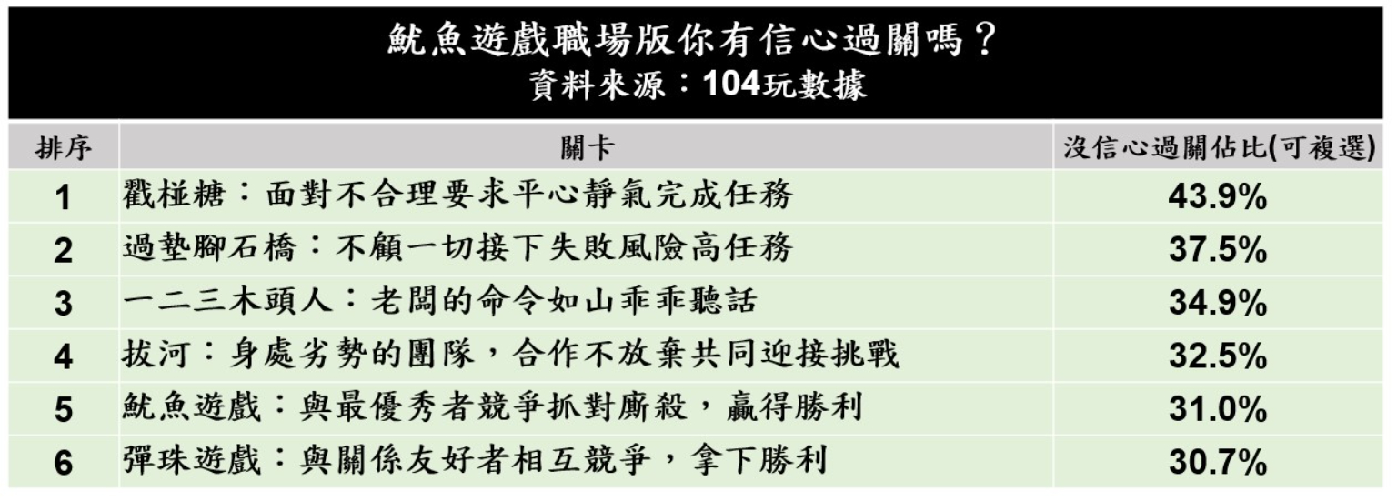 《魷魚遊戲》職場版的票選結果,顯示職場上班族最怕的是「戳椪糖」。(圖/104玩數據提供)