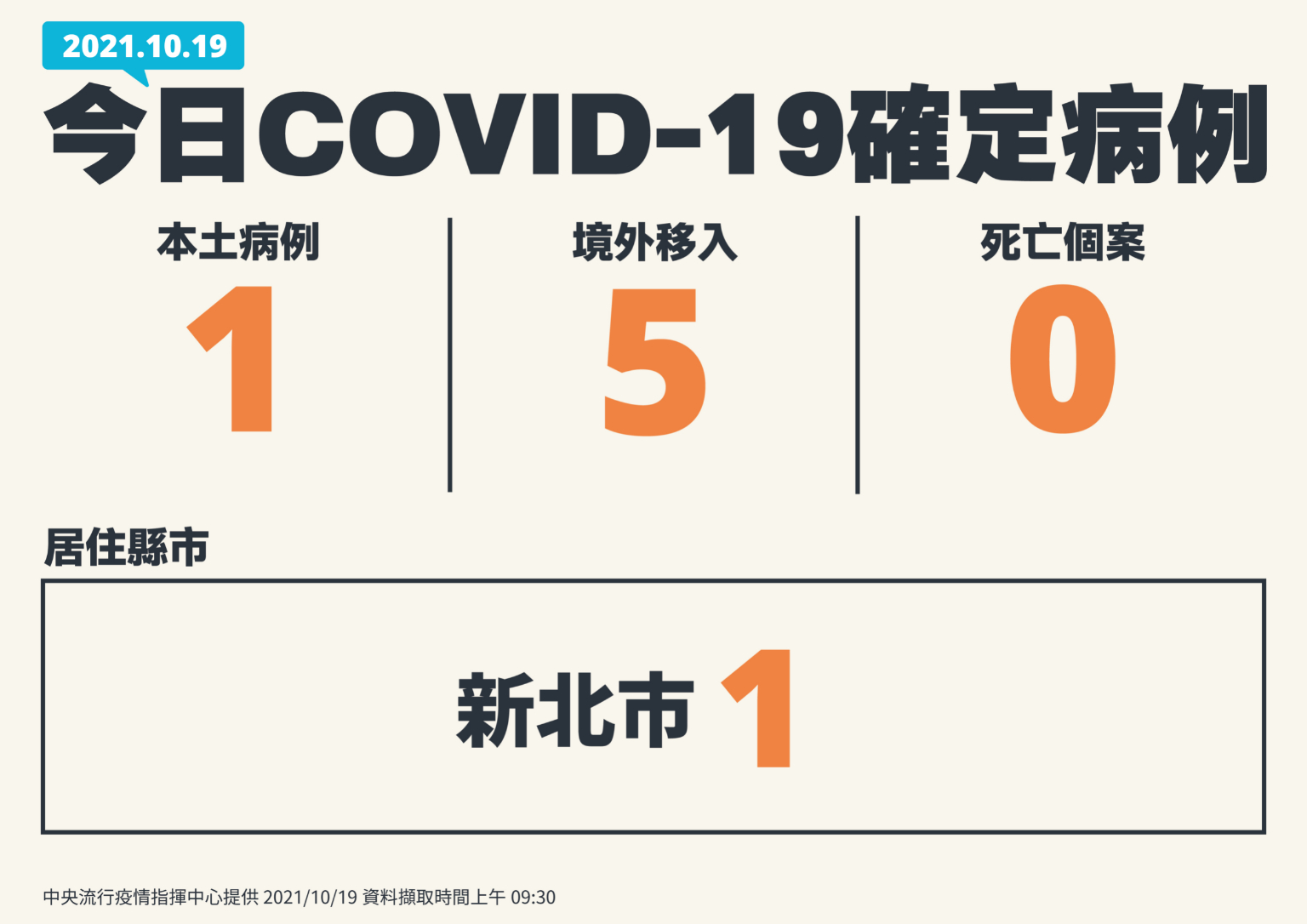 中央流行疫情指揮中心今(19)日公布國內新增6例COVID-19確定病例,其中4例都屬突破性感染,分別為1例本土、5例境外移入;另確診個案中無新增死亡。