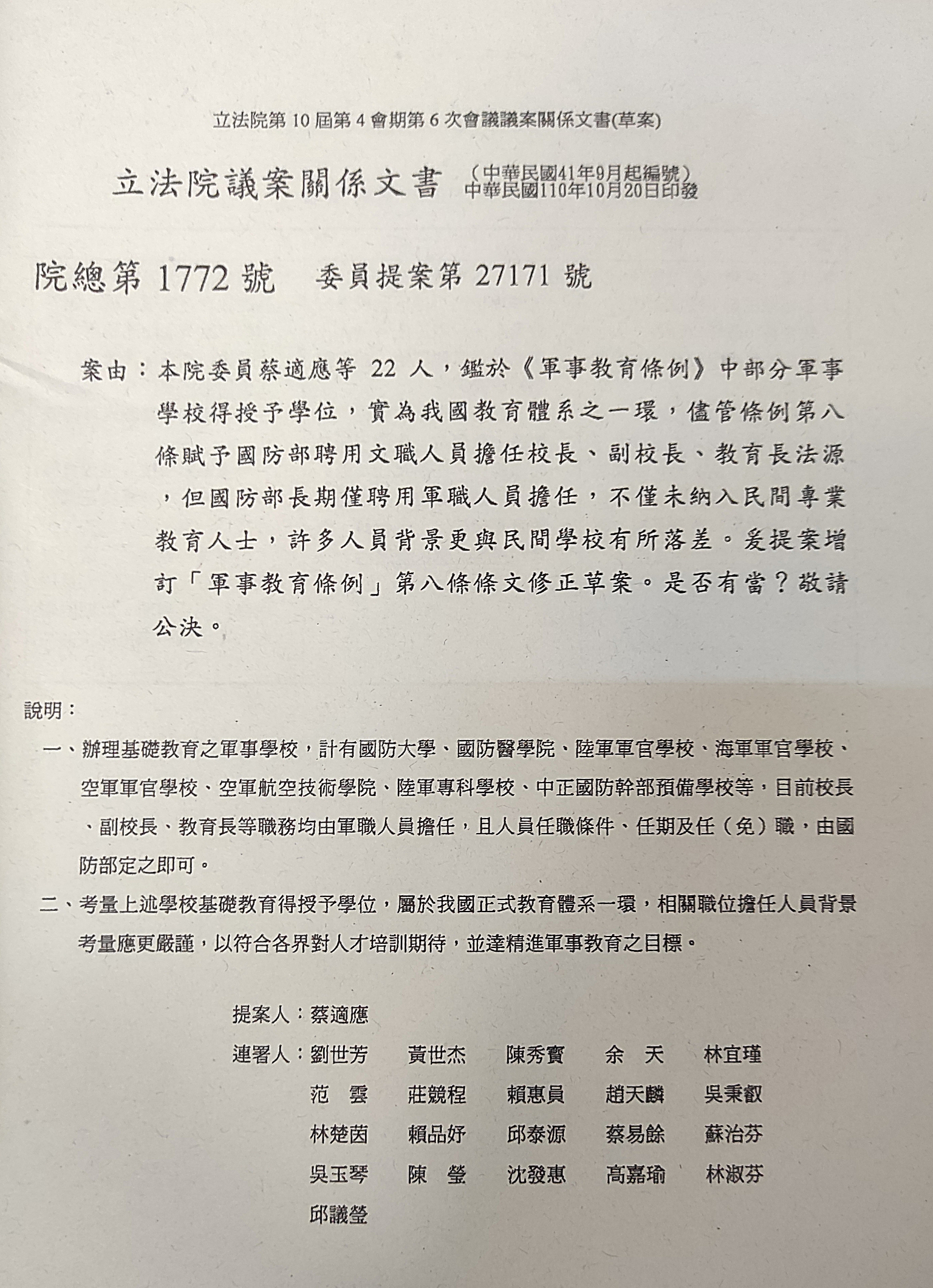 蔡適應日前領銜提案修改《軍事教育條例》第8條,表示部分軍事學校得授予學位,為我國教育體系一環,但國防部長期聘用軍職人員擔任校長、副校長、教育長,不僅未納入民間專業教育人士,許多人的背景更與民間學校有所落差,遂將原條文改為依《教育人員任用條例》辦理,使得軍校校長的任用資格變成須有碩、博士資格,或有教授行政工作資歷,或曾任政務官兩年以上並具有教授資格且成績優良者。
