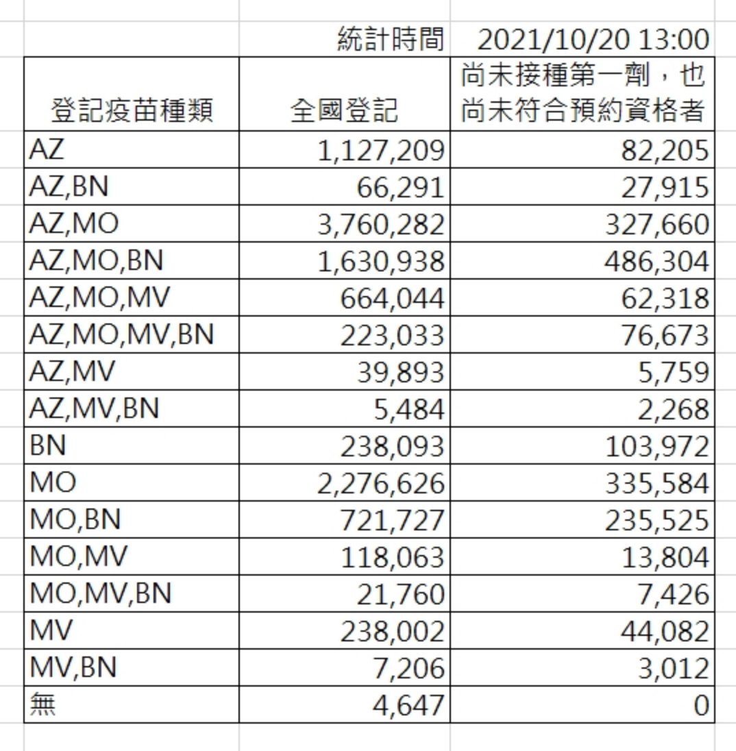 10/18 10:00-10/20 12:00 第12期第一階段BNT第1劑預約狀況(截至10/20 12:00,已截止)