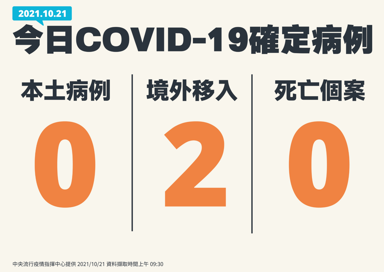 中央流行疫情指揮中心今(21)日公布國內新增2例境外移入COVID-19確定病例,自美國(案16458)、緬甸(案16459)入境;另確診個案中無新增死亡。