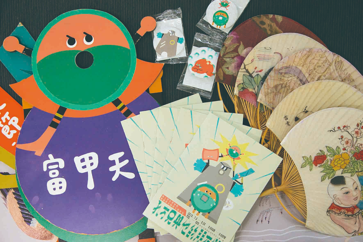 展件包括設計師黃國瑜利用糕點模具概念,將灶神的圖形與模具做結合,傳統信仰有了全新的表現手法;設計師顏伯駿以複合媒材混合繡線與刺繡的手法,重新詮釋版畫的細節與魅力。此外,設計前衛且可帶在身上行走的團扇、以育樂為概念設計神祇尪仔標、門神意象變成居家裝飾物件和生活器皿,全都令人眼睛為之一亮。
