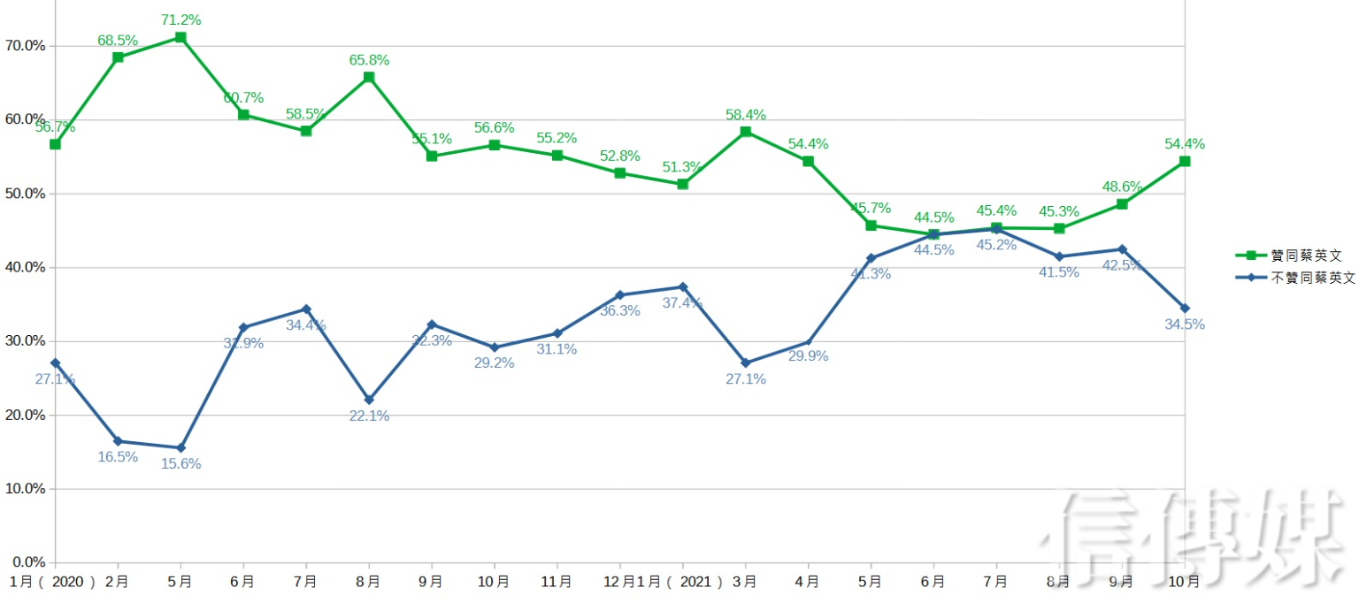 根據台灣民意基金會最新民調,本月總統蔡英文正面聲望達到54.4%,負面聲望34.5%,正面比負面多了19.9%,且較上月多增加5.8%正面聲望,創下5月疫情以來新高,並且正好回到4月的正面聲望。