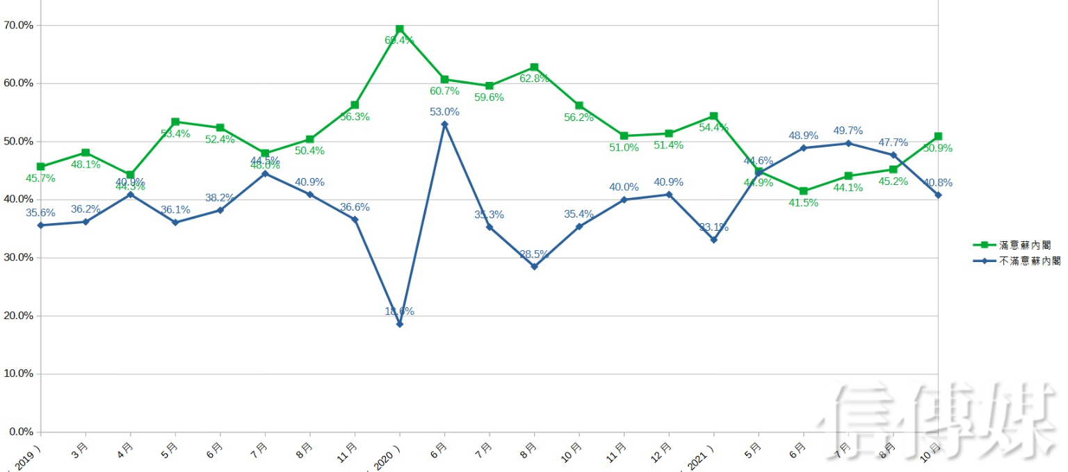 同一時間,蘇貞昌內閣也有好表現,其本月施政滿意度達到50.9%,不滿意度為40.8%,滿意比不滿意多了10.1%,且較上月多增加5.7%滿意度,同樣也是5月疫情以來的新高。