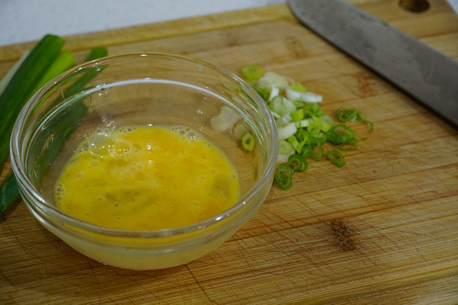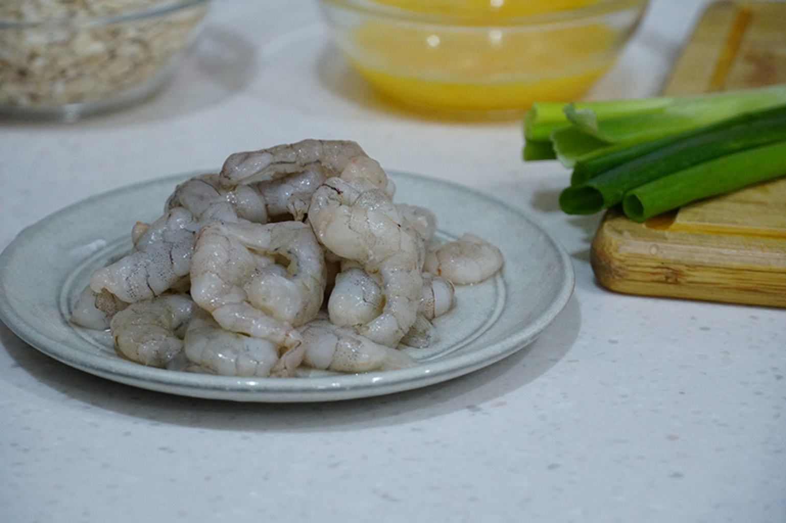 這次因為使用的是冷凍白蝦仁,所以製作更加簡單。備料部分只要將青蔥切碎、打蛋花一顆。