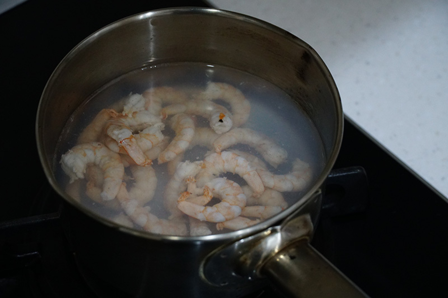 水滾後放入蝦仁川燙20秒,這過程就可以讓湯頭有基本鮮甜味。
