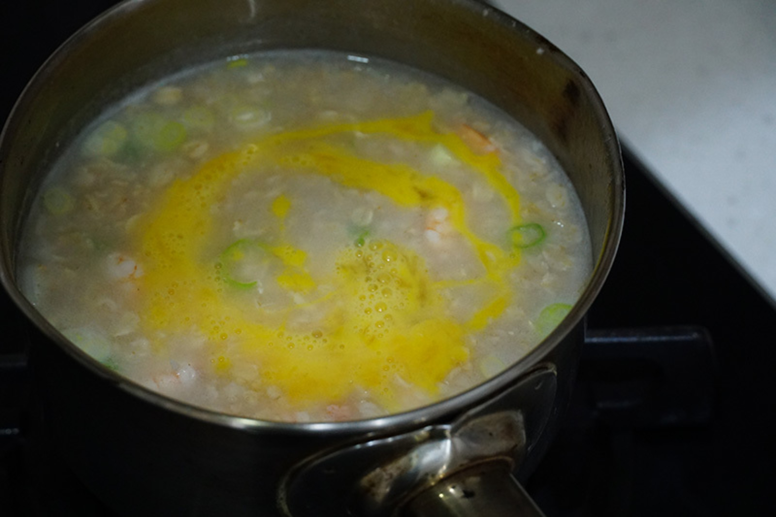 關火後淋上蛋液,利用燕麥粥餘溫煮熟雞蛋即可。