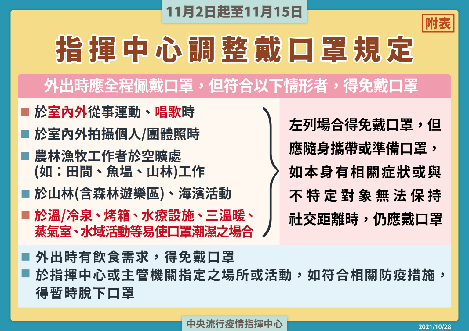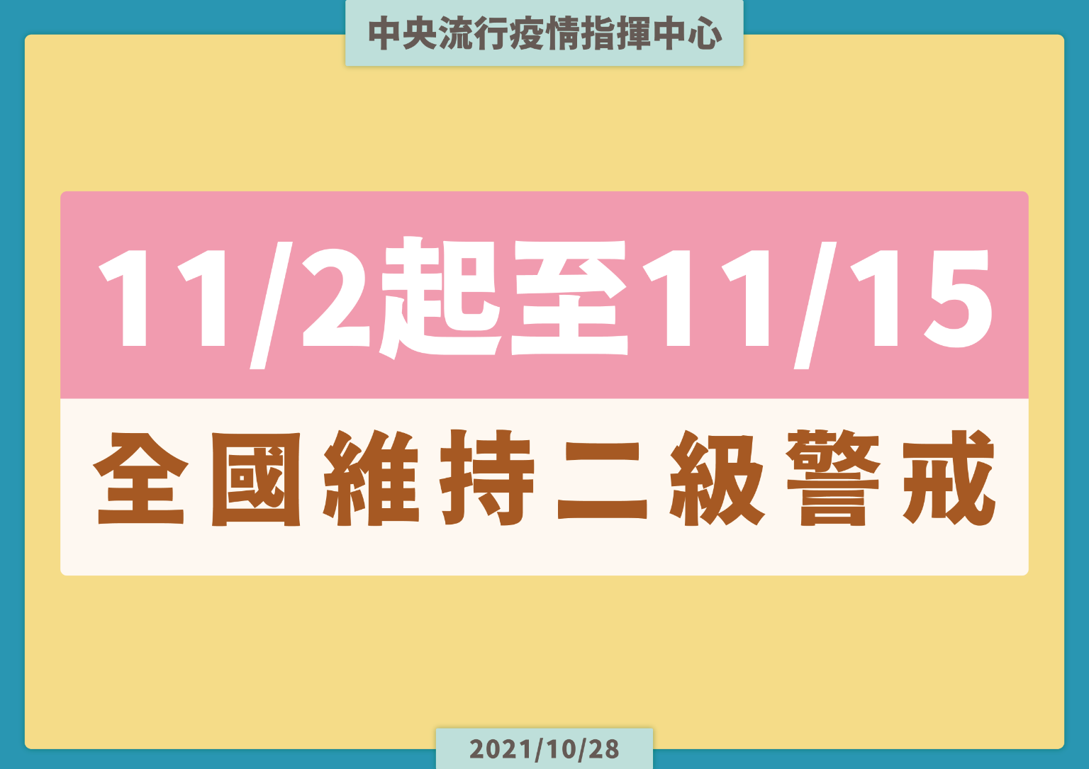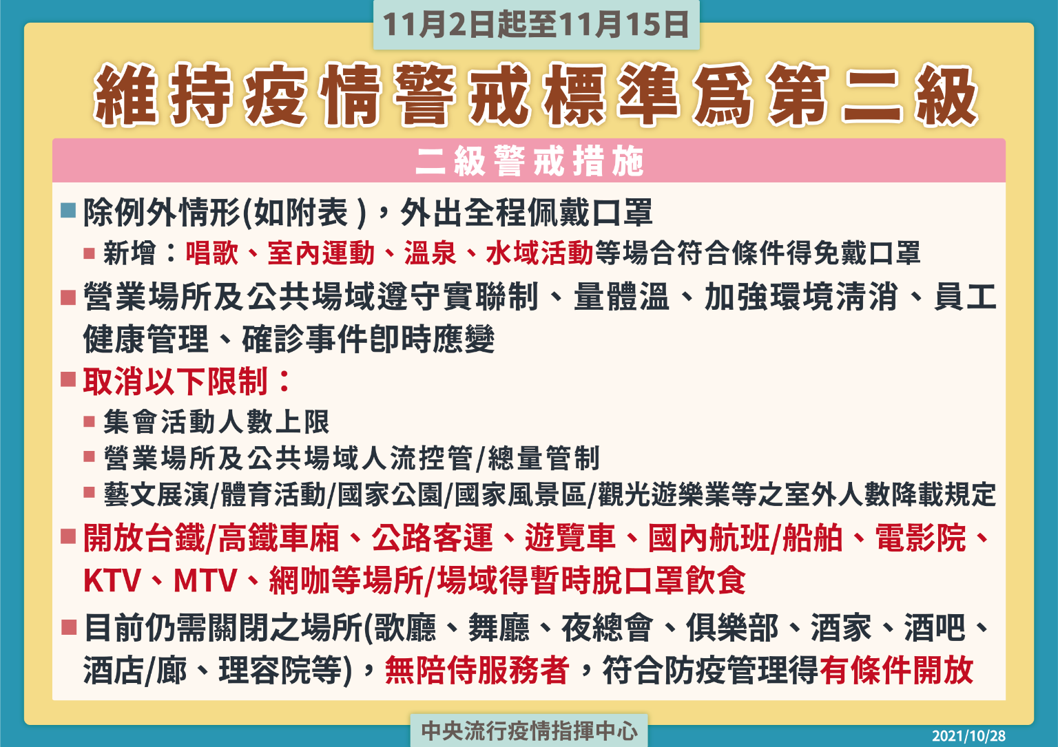 考量國內疫情目前已趨緩並且穩定控制,經與相關單位溝通討論及評估後,中央流行疫情指揮中心今(28)日宣布,自今(2021)年11月2日至11月15日維持疫情警戒標準為第二級,調整相關措施及規定如下: