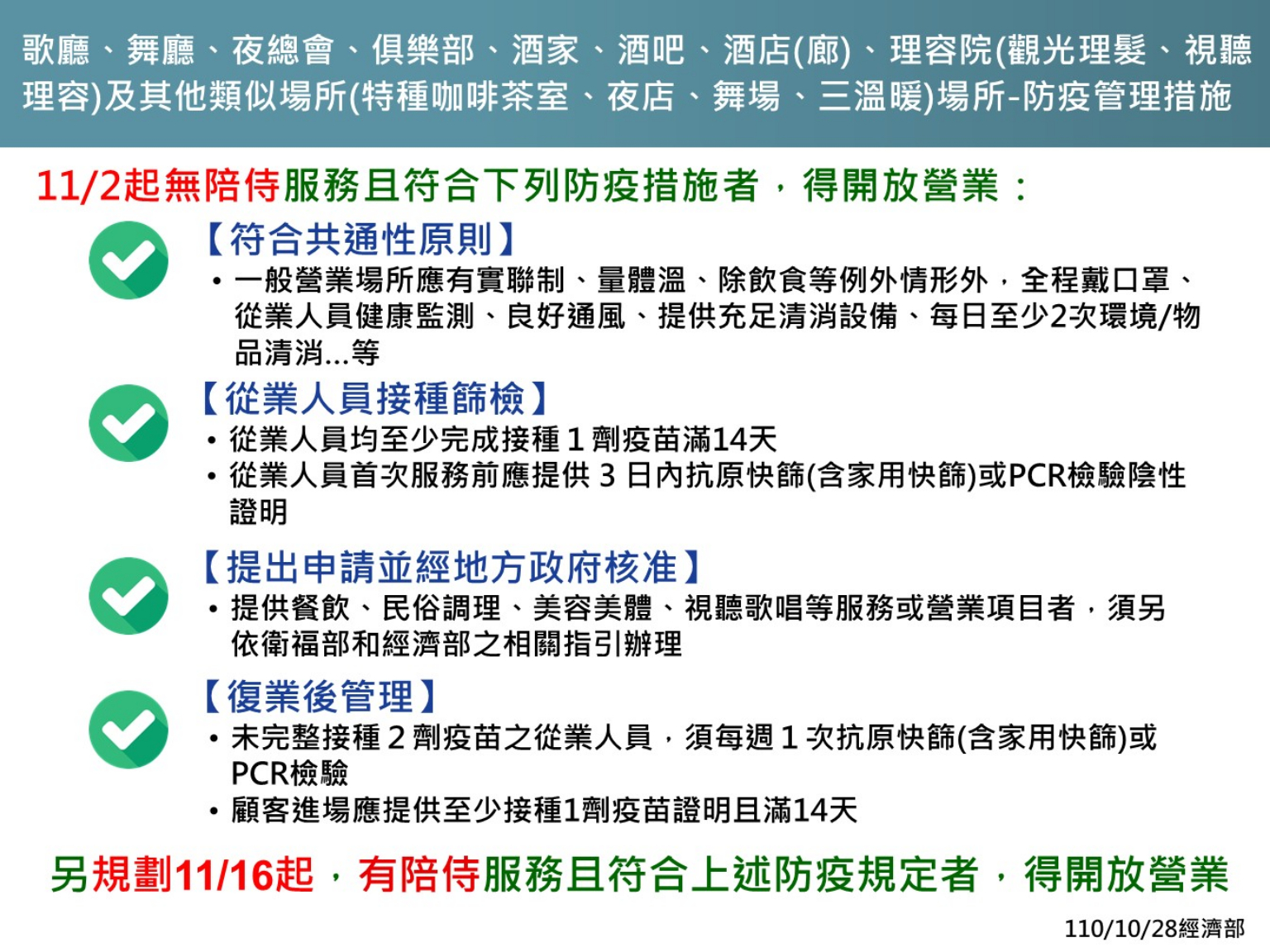 二、目前仍需關閉之場所(歌廳、舞廳、夜總會、俱樂部、酒家、酒吧、酒店/廊、理容院等),無陪侍服務者,符合防疫管理得有條件開放。