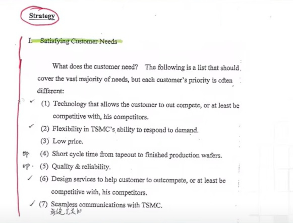 台積電的技術要能讓客戶保有競爭力,至少,要能讓客戶和其對手維持競爭力。第二、台積電必須具有回應市場需求的彈性。第三、維持價格競爭力,即低價。
