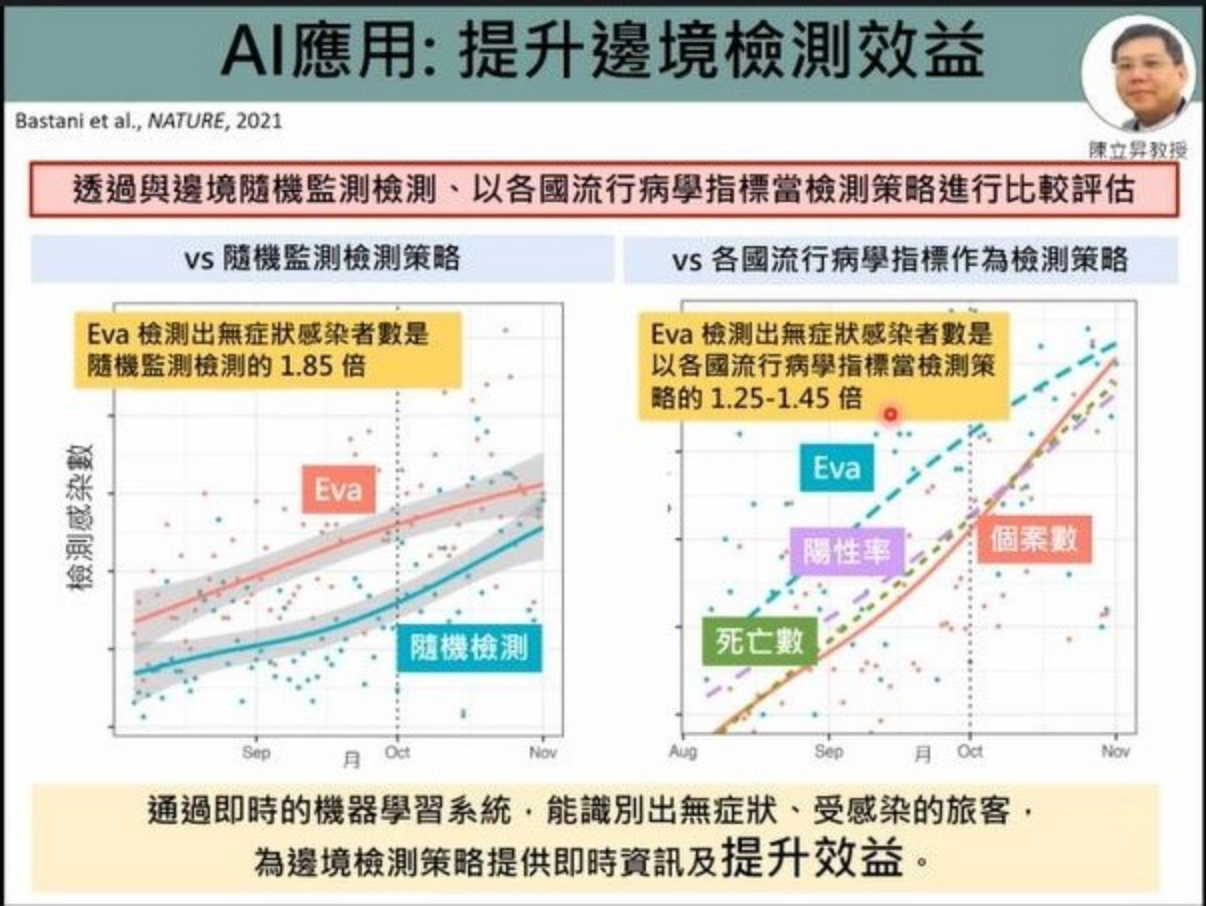 「結果發現Eva找出的無症狀感染者數量,是隨機檢測的1.85倍!對於依照各國流行病學指標作為檢測策略相比,能找出感染者數目為不同指標的1.25-1.45倍間。」陳立昇表示。