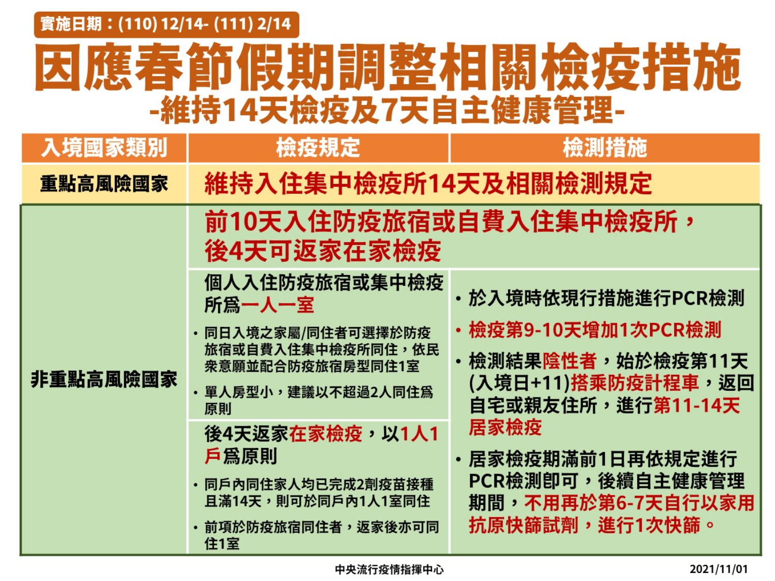 中央流行疫情指揮中心今(1)日表示,由於國內COVID-19疫情趨緩及部分國家COVID-19疫苗接種率提升,並考量農曆春節將近,旅外國人返鄉心切,本中心規劃自本(2021)年12月14日至明(2022)年2月14日期間,維持14天檢疫及7天自主健康管理,相關措施調整如下: