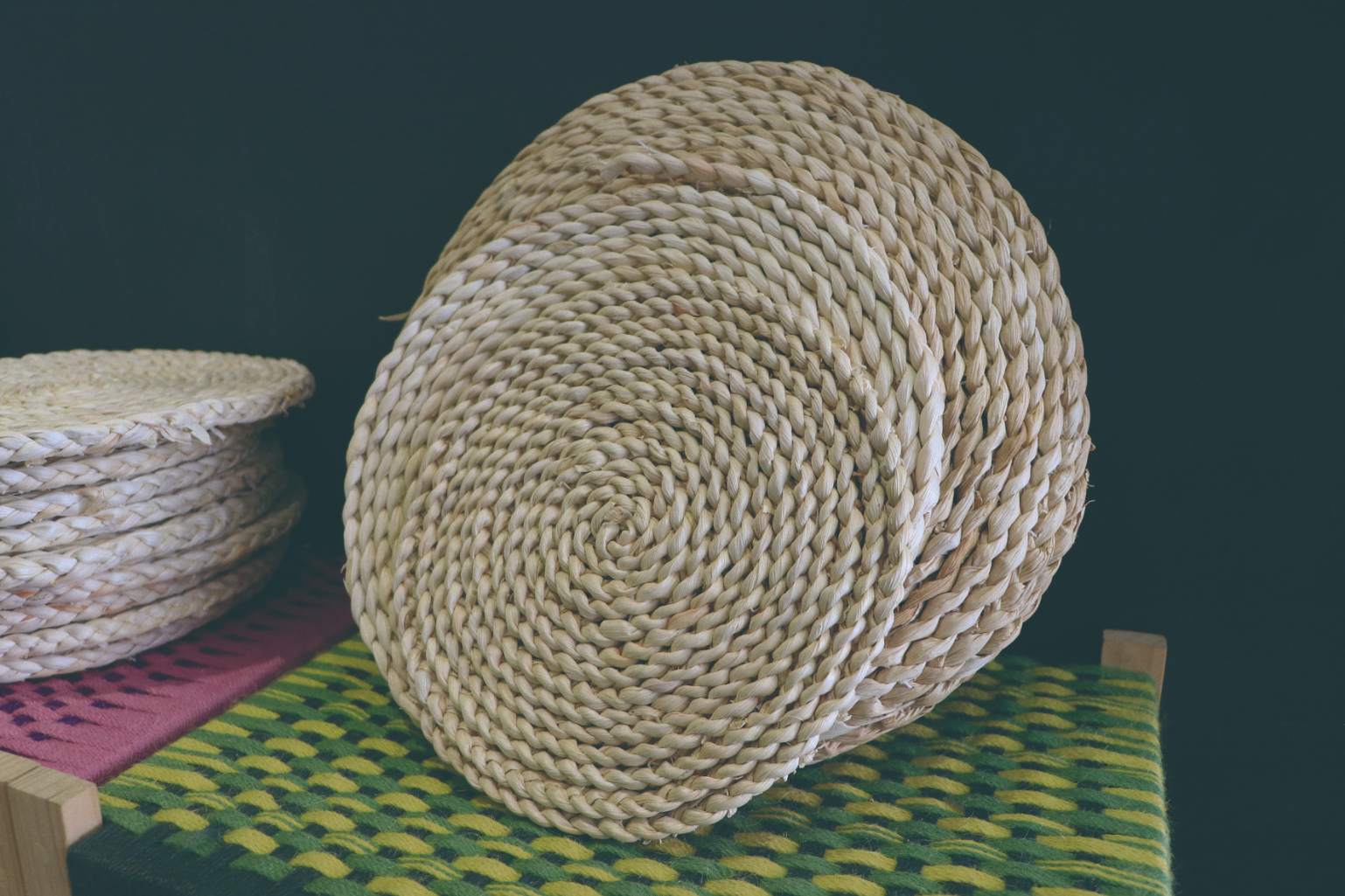 去年,工作室將學甲經濟作物的下腳料納入創作素材,開發小麥梗吸管、絲瓜絡杯墊、玉米葉蒲團等產品。取自大地的材料,從整理、保存、取纖到編織都格外費工,光是一個鳳梨纖維零錢包就使用十片鳳梨葉,這也是再生素材產品價格較高昂的原因。