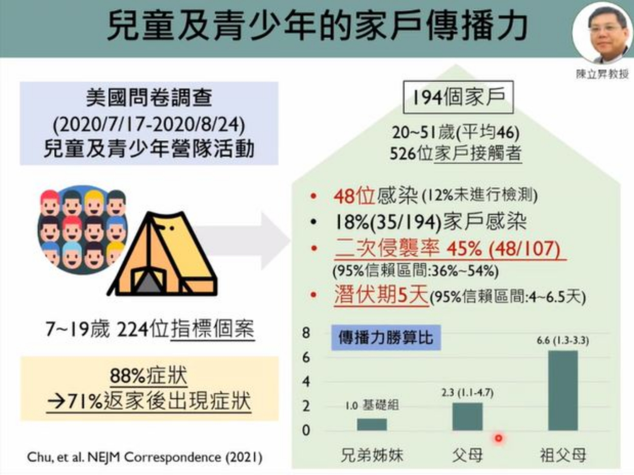 陳立昇指出,美國一份在尚未有疫苗前做的調查,針對參加營隊活動後224位兒童及青少年指標個案後續所引起的家戶傳播進行討論,其中有88%是症狀個案,而在症狀個案中更有71%個案是返家後才產生症狀。