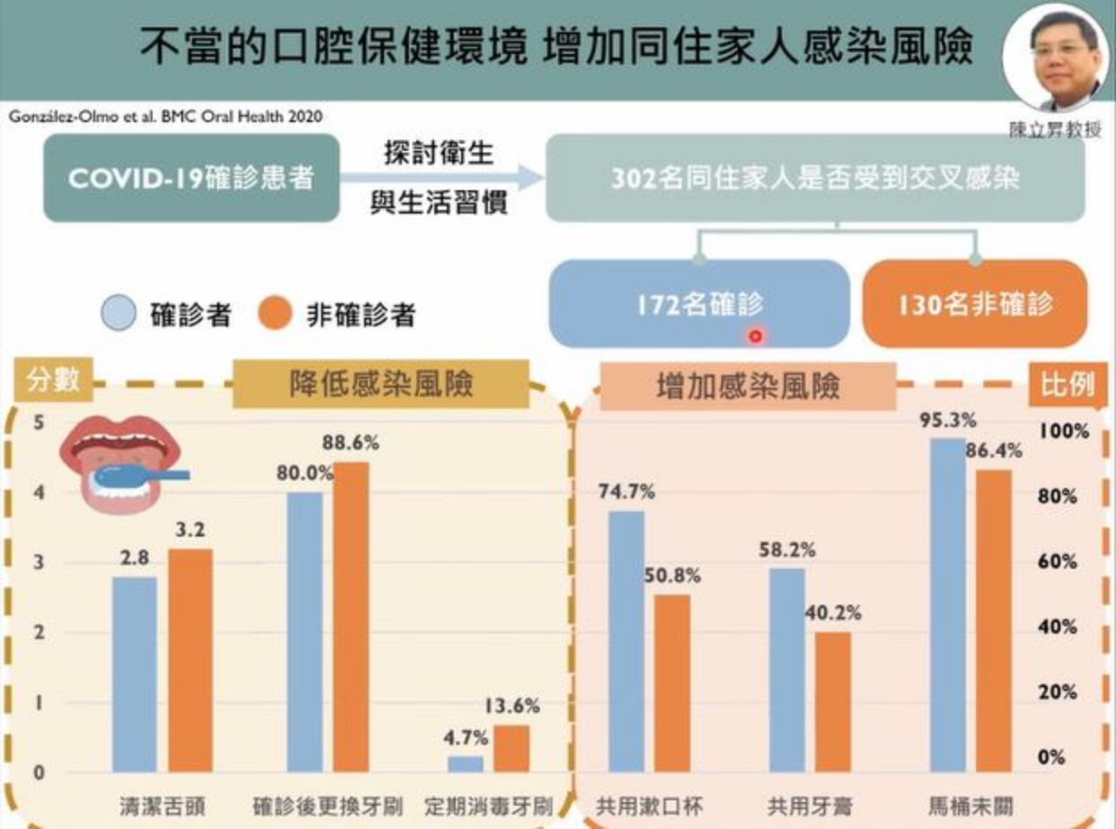 陳立昇指出,西班牙一項研究發現,口腔保健習慣也會影響新冠肺炎於家戶內的傳播風險。該研究從確診者出發,針對302名同住家人是否受到交叉感染,其中172名確診、130名非確診,調查其家庭口腔衛生習慣,再連結其家人是否有感染。