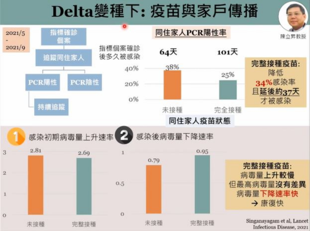 另一項英國研究,針對Delta病毒的指標確診個案連結其同住家人,針對同意參與研究者提供PCR檢測,以此追蹤Delta變種侵襲下家戶內傳播與疫苗狀態的關係。陳立昇指出,研究結果發現,「整體而言同住家人若完整接種疫苗,可以降低34%的感染;針對感染者也發現,完整施打疫苗者須接觸更多天才會被感染,延後約35天。」