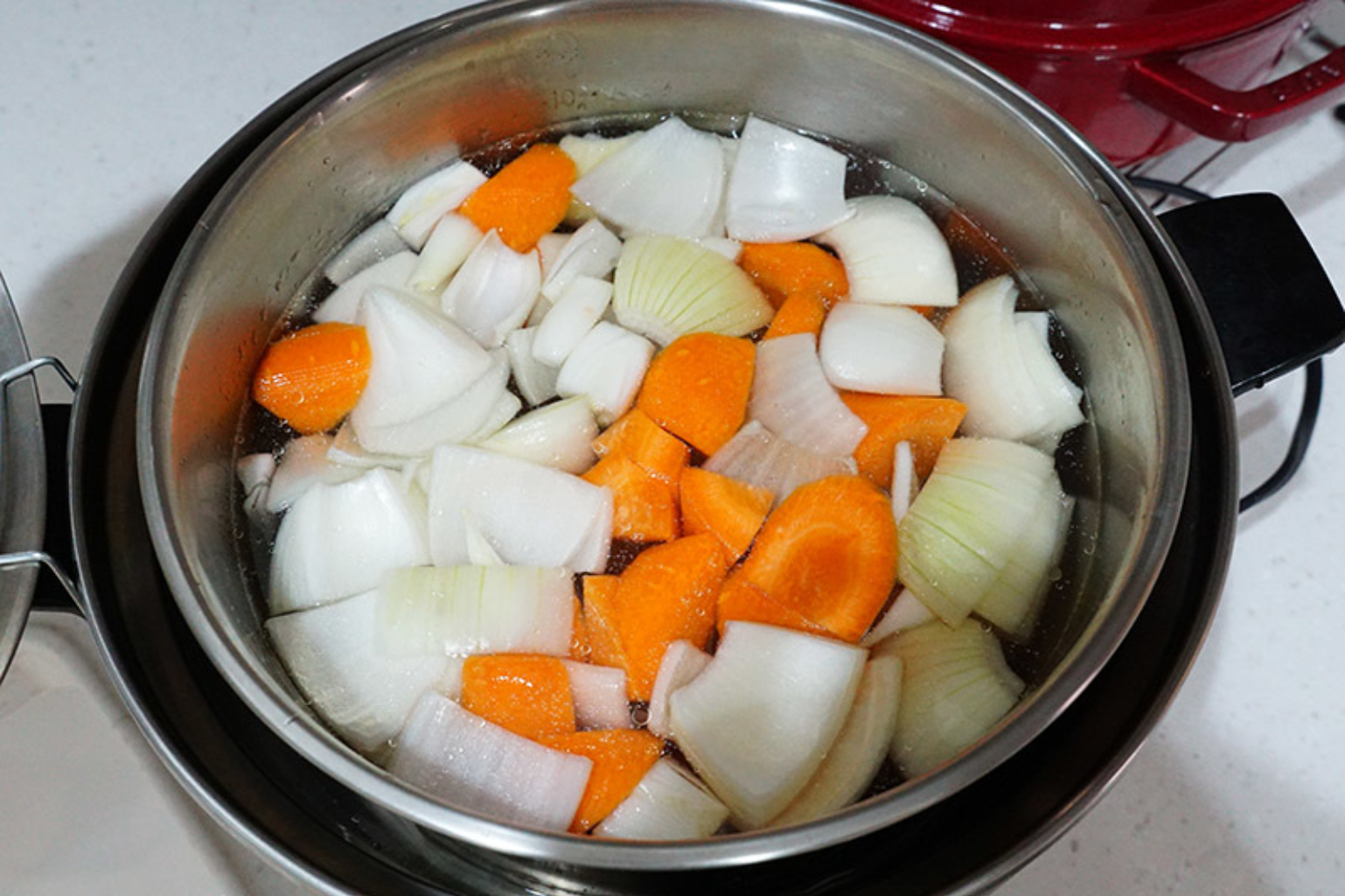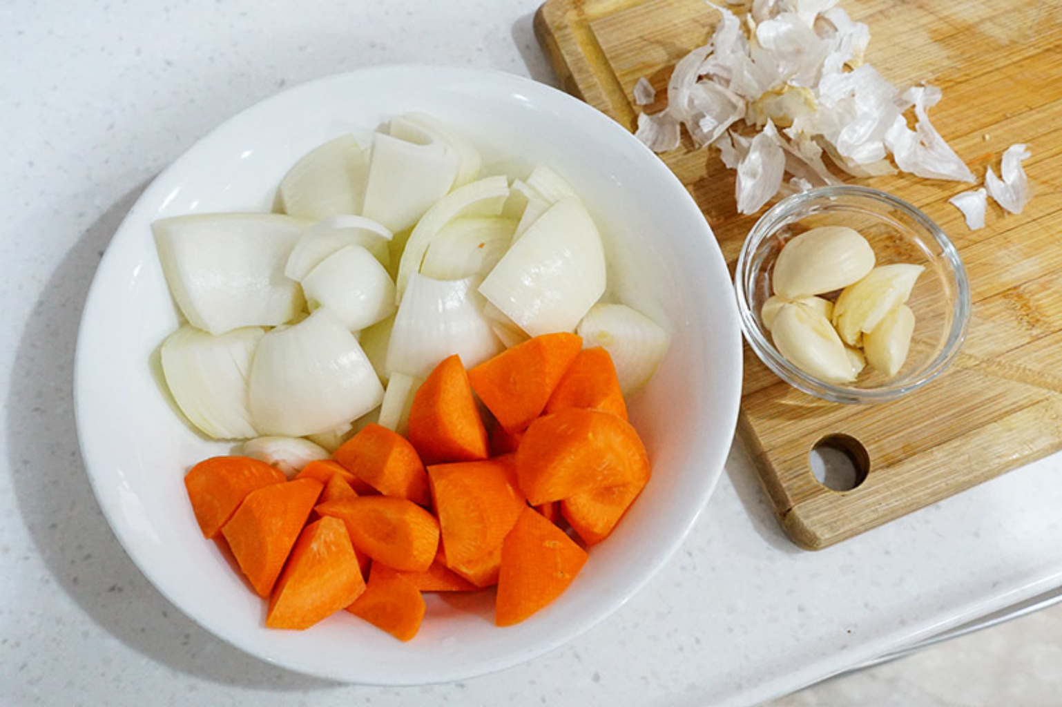 備料部分,將蒜頭剝皮,保留「整顆」狀態。將洋蔥切方塊,胡蘿蔔切適口的塊狀大小。