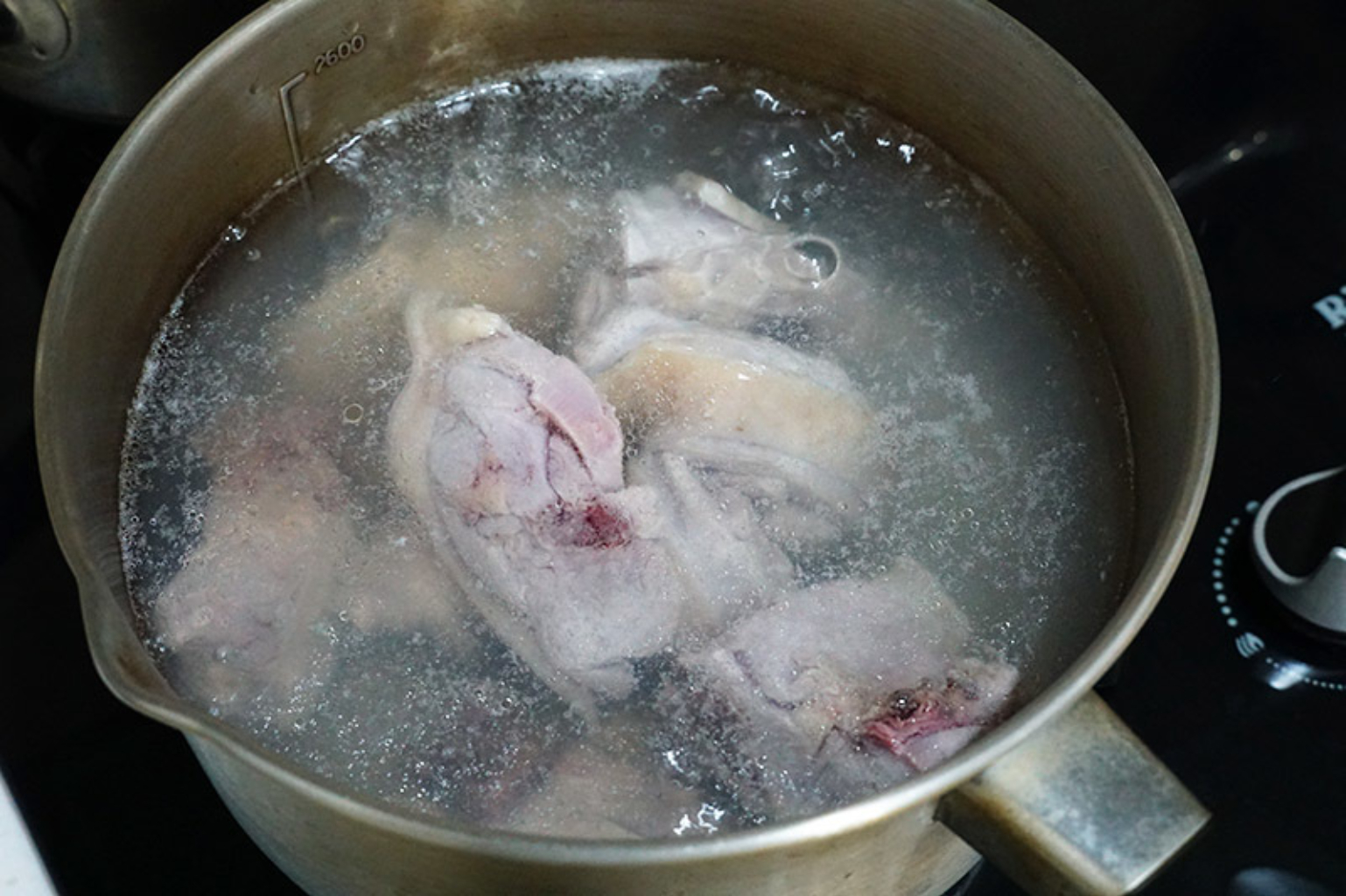 先準備一鍋熱滾水,川燙雞腿肉約3分鐘起鍋備用。要做這個步驟是因為要先將雞肉的骨血與髒污煮出,這樣等等煮湯的湯頭就會很清澈鮮甜沒腥味。