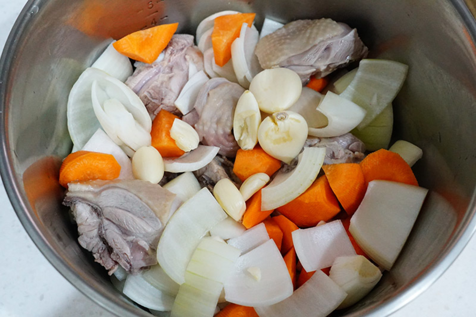 取電鍋可以用的鍋子,放入雞肉、洋蔥、胡蘿蔔、大蒜。