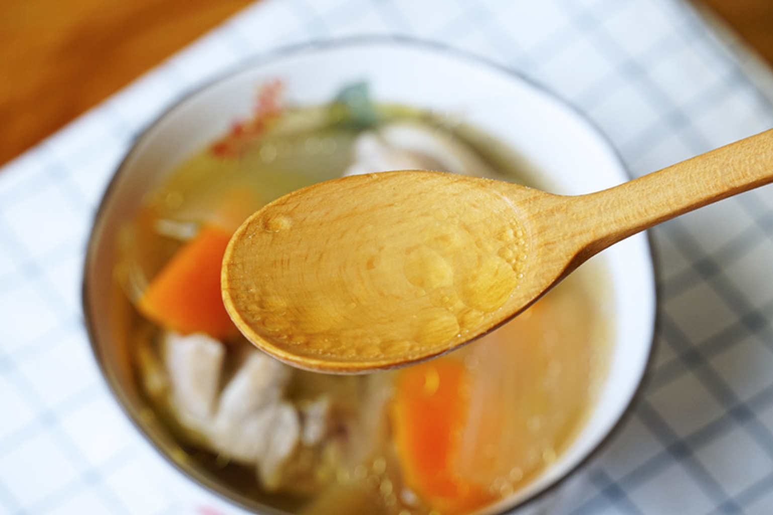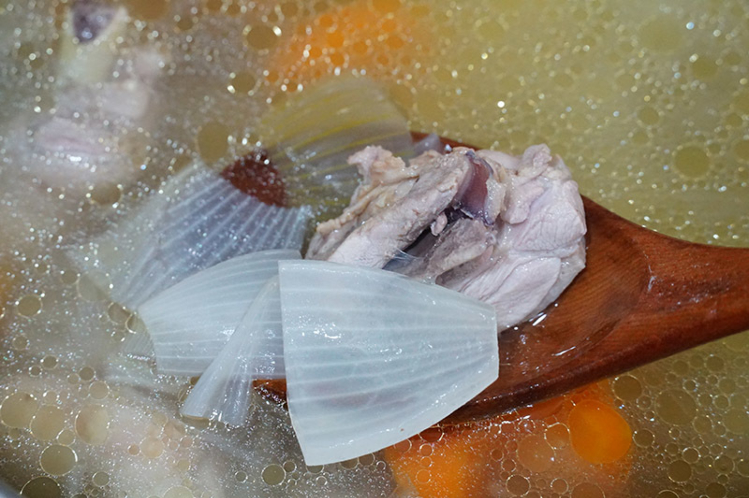 帶骨的目的是在這樣熬煮出來的雞湯的湯頭才會好喝。