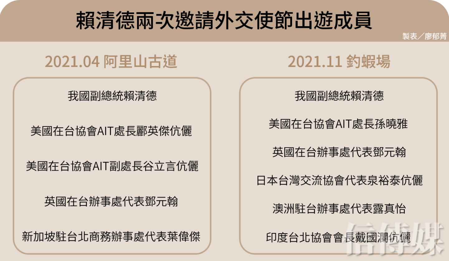 賴清德上任後,除正式場合外,私下外交作為也相當積極。4月也曾邀請外國使節一同上阿里山特富野古道健行,一路上和使節們有說有笑。鄧元翰當時也有出席,前任AIT處長酈英傑也偕同伉儷參與,不過同赴阿里山的新加坡駐台北商務辦事處代表葉偉傑,這次則缺席釣蝦場。