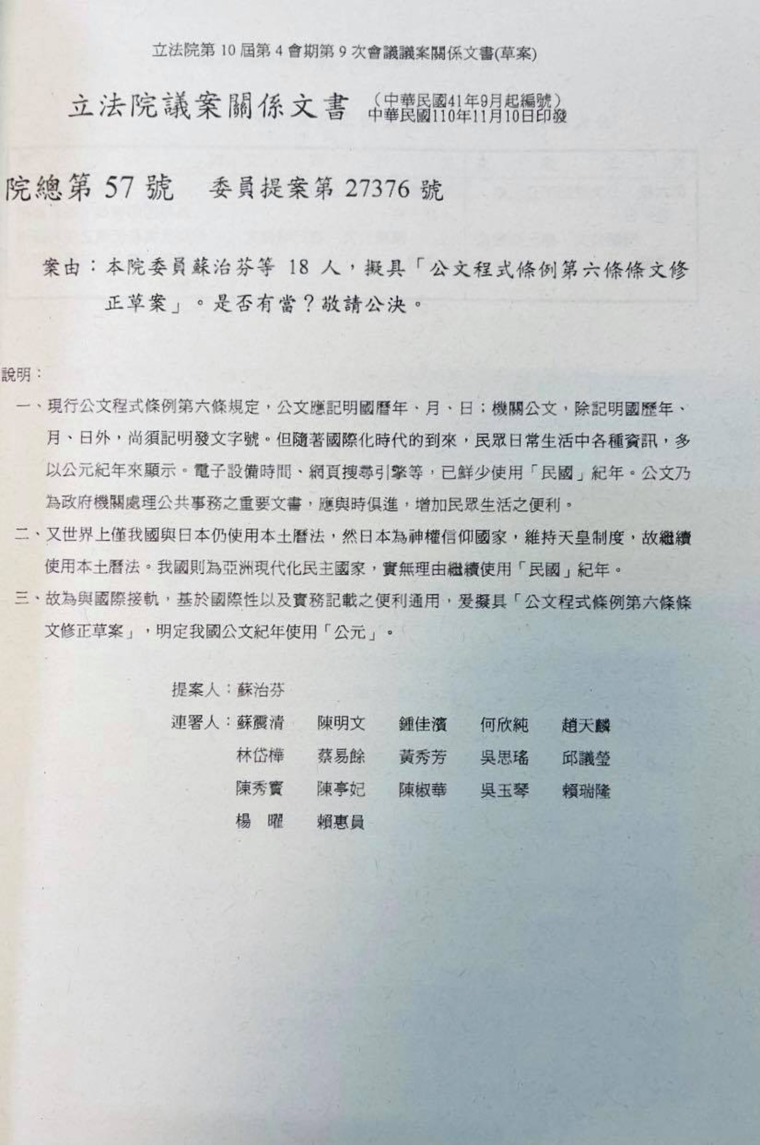 提案內容指出,國際化時代已到來,民眾的生活資訊多以公元紀年標示,電子設備時間、網頁搜尋引擎等,也都鮮少使用民國紀年,政府公文也應與時俱進。草案中也提及,全球只有我國和日本仍使用本土曆法,但日本屬神權信仰國家,有天皇統治制度,因此繼續使用。我國是亞洲現代化民主國家,並無理由使用本土曆法來紀年。