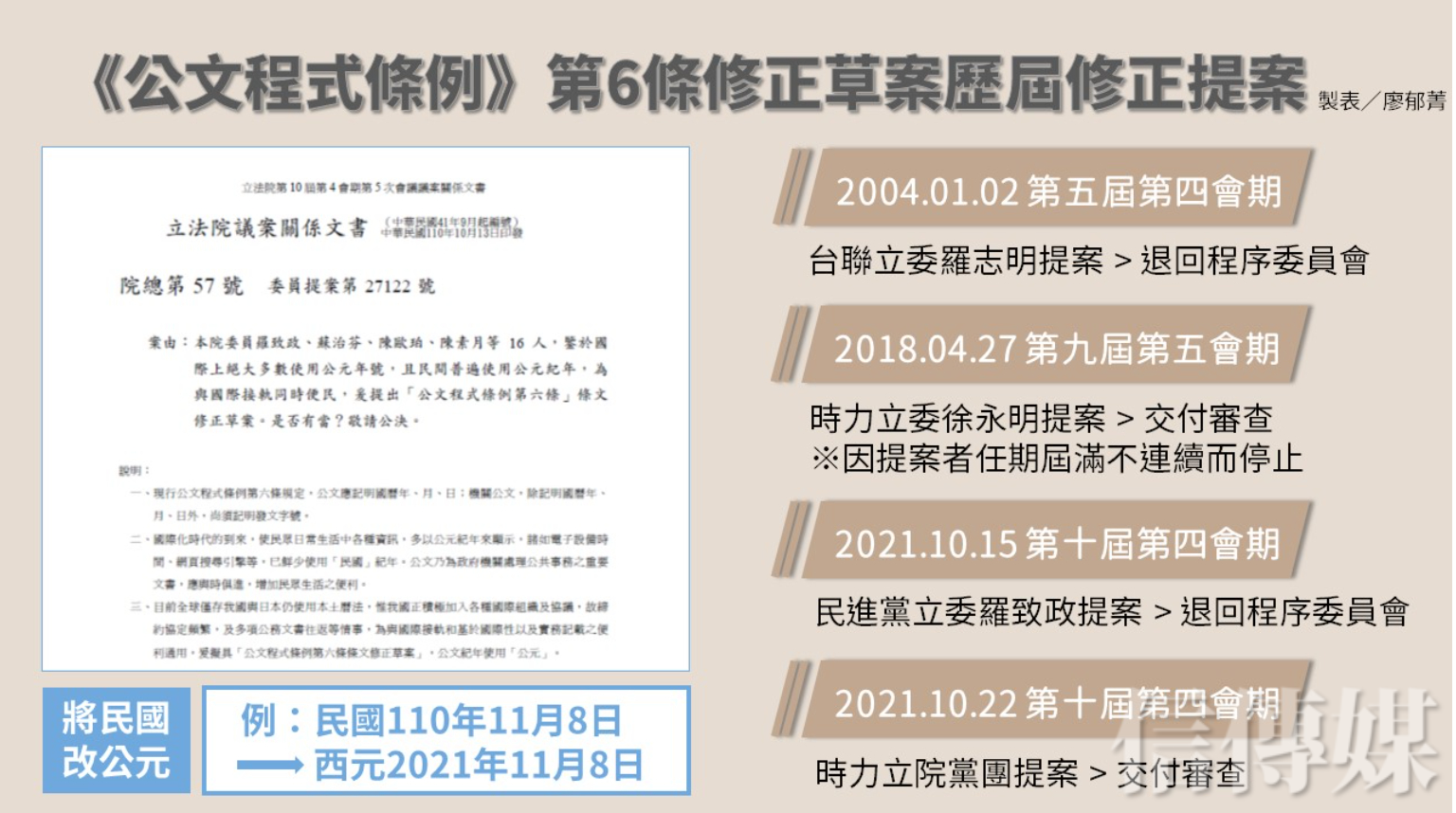 其實這並非《公文程式條例》第6條首度提出修正。2004年台聯立委羅志明便曾提案要修正紀年,但被退回程序委員會;2018年時代力量立委徐永明也曾提案,然而因提案人徐永明後遭停權並宣布退黨,未能參選連任,在屆期不連續情況下無法繼續審查,只完成一讀便不了了之。