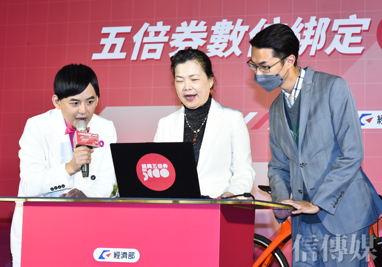 經濟部今(9)日舉行加碼抽獎活動,由經濟部長王美花抽出3名幸運兒,可獲得由業者提供3台Gogoro電動單車,每台價值12萬元;另外,為感謝民眾選擇綁定數位,經濟部也再加碼提供優質好禮,給一起觀看直播留言的民眾抽獎。