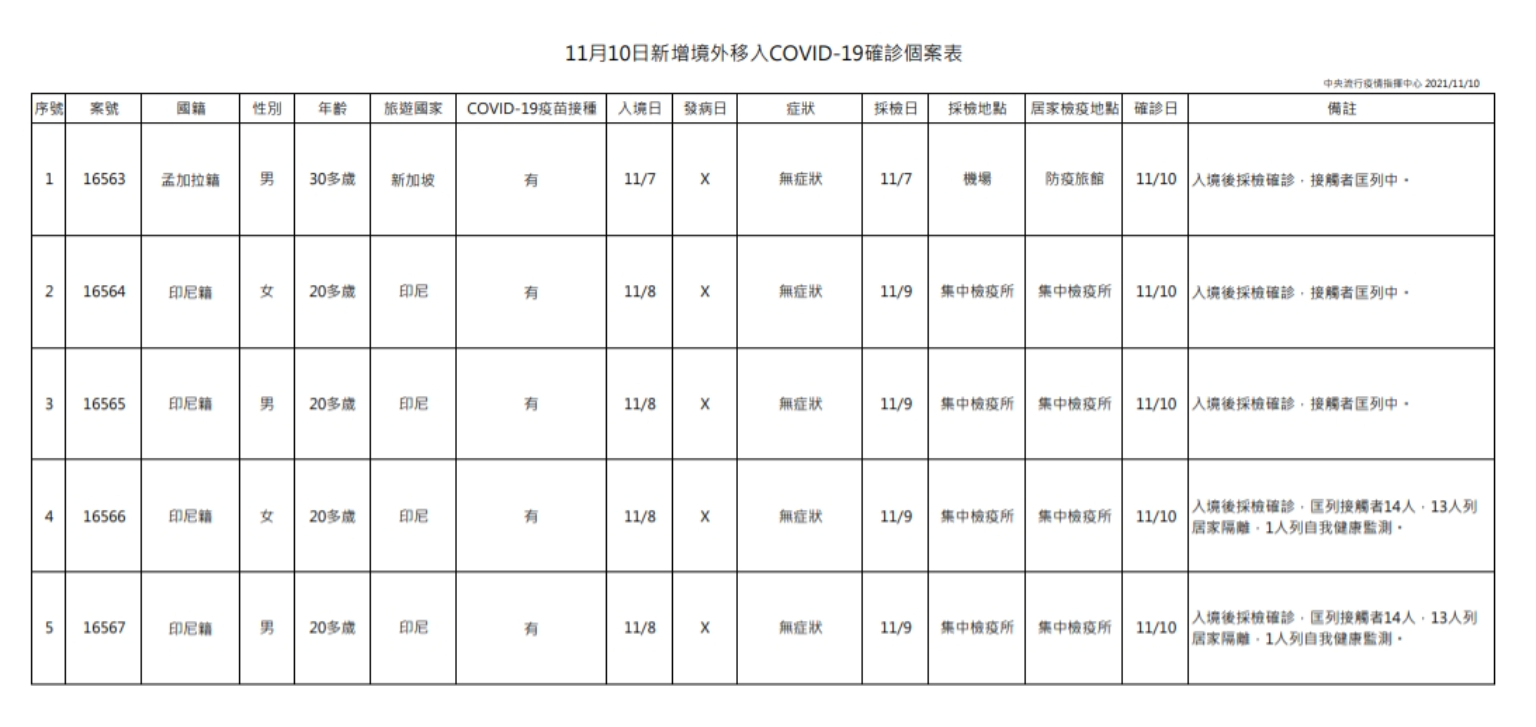 指揮中心發言人莊人祥表示,今日新增5例境外移入個案,為3例男性、2例女性,年齡介於20多歲至30多歲,分別自新加坡(案16563)及印尼(4例,案16564至案16567)入境,入境日介於今(2021)年11月7日至11月8日;詳如新聞稿附件。