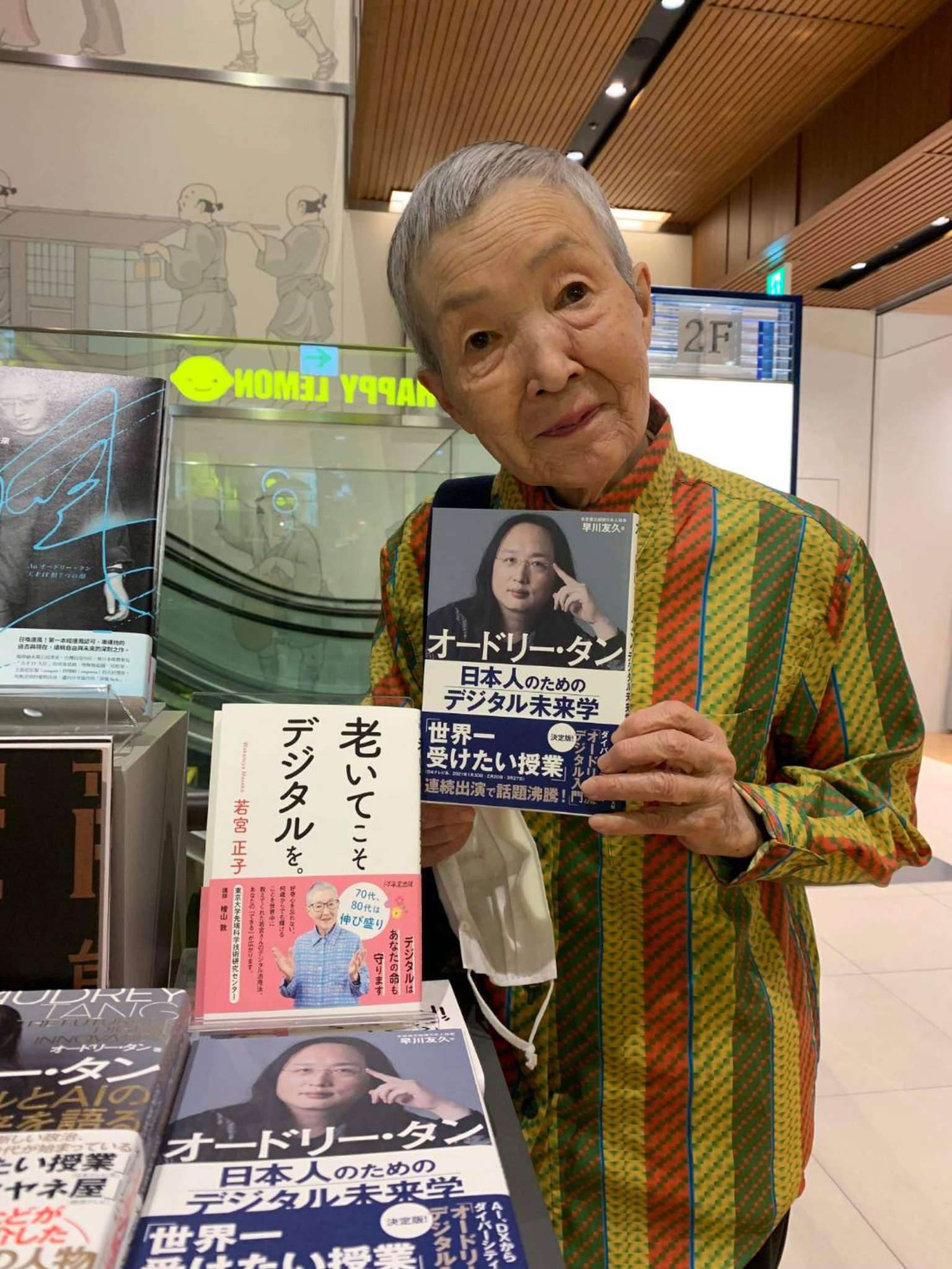 唐鳳40歲、若宮正子86歲,兩人對談火花四射,有全世界最年長工程師之稱的若宮也相當健談。若宮在82歲時自學開發APP,現在是日本現任數位廳數位社會構想會議成員之一,也是首位使用Excel軟體進行藝術創作的創作者。