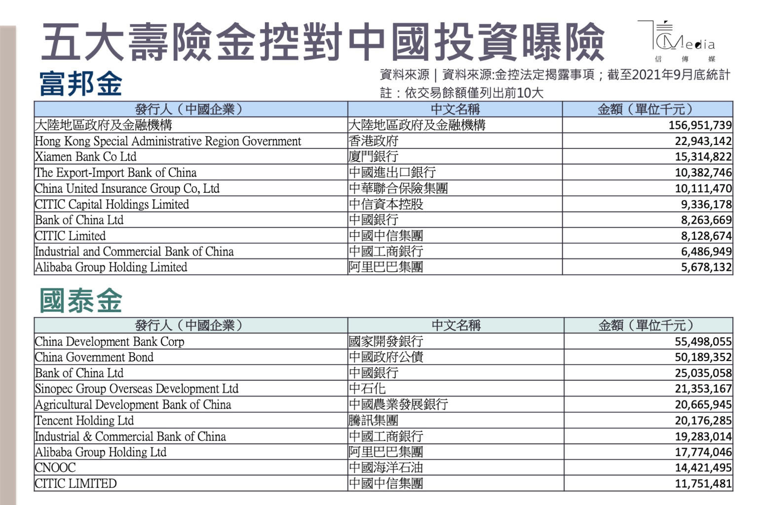 從這份申報資料當中,統計五大壽險金控對中國、香港投資的曝險,包括公司債、金融債以及與股權相關的有價證券,截至今年9月底,以國泰金在中國投資的餘額最高,來到3788.65億元,其次是富邦金3038.83億元,中信金則為1557億元,即將完成中壽併購案的開發金也有1099.42億元,最後則是新光金投資餘額527.22億元。