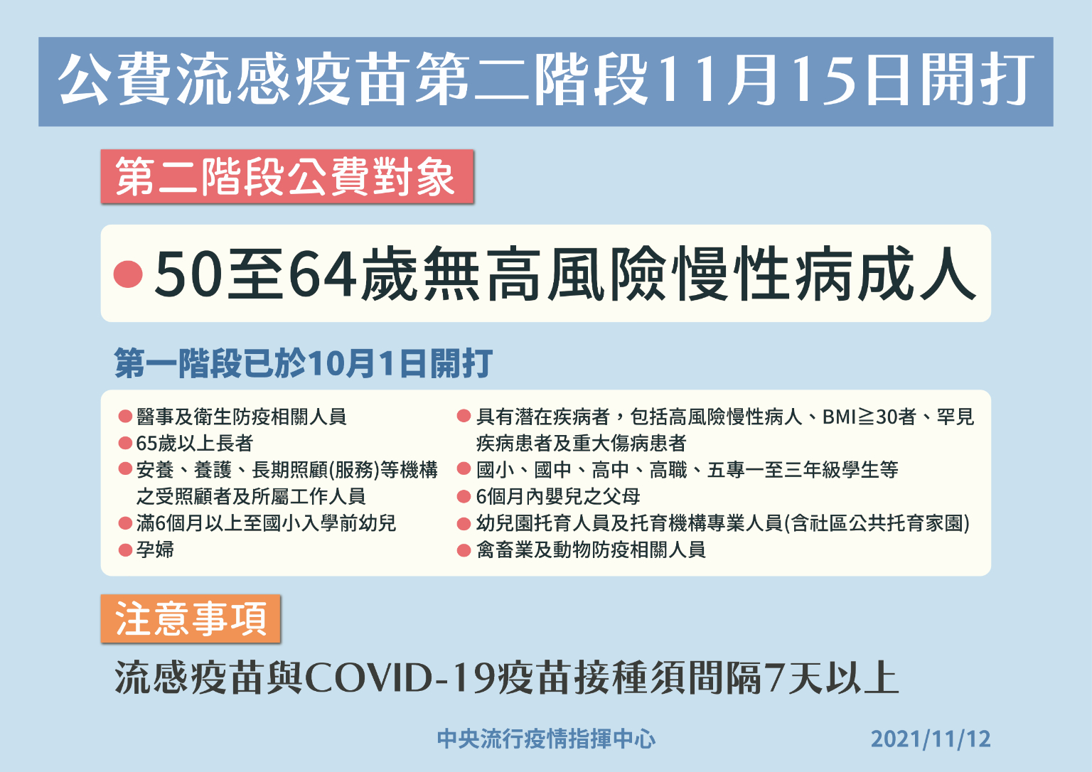指揮中心表示,有緊急出國需求之民眾可透過各縣市政府衛生局指定有提供該等服務之合約醫院預約接種,目前國內核准專案輸入之COVID-19疫苗,依核准均建議接種兩劑,其中AstraZeneca COVID-19疫苗兩劑間隔為4-12週,BioNTech COVID-19疫苗兩劑最小間隔為21天,Moderna COVID-19疫苗兩劑最小間隔為28天。