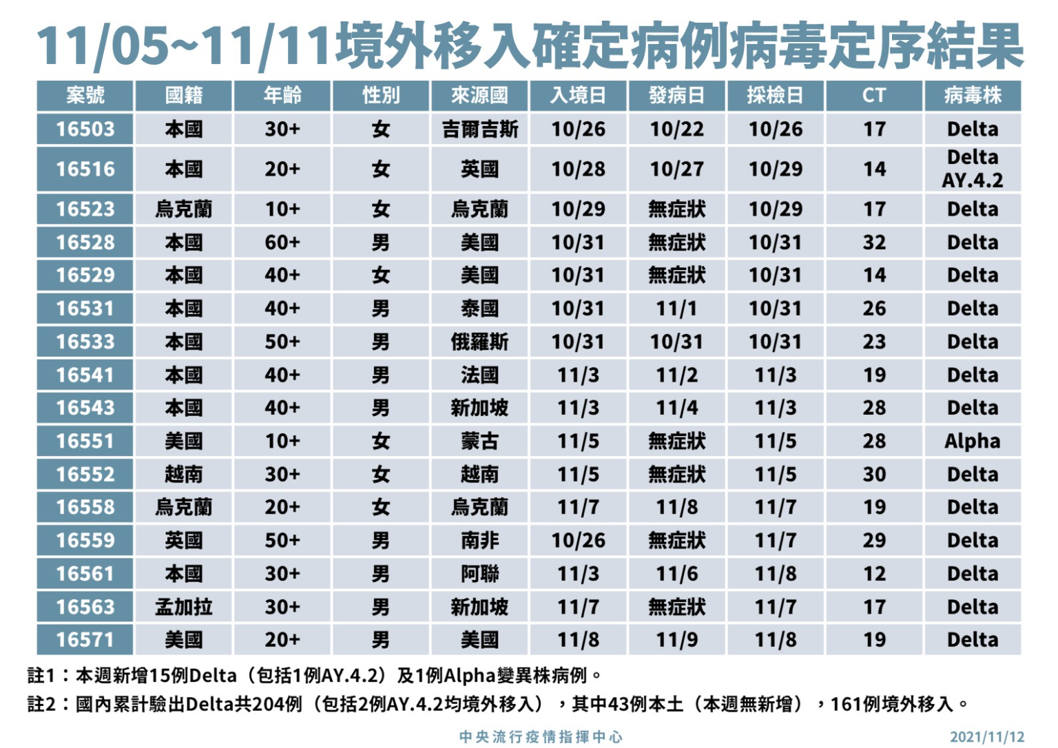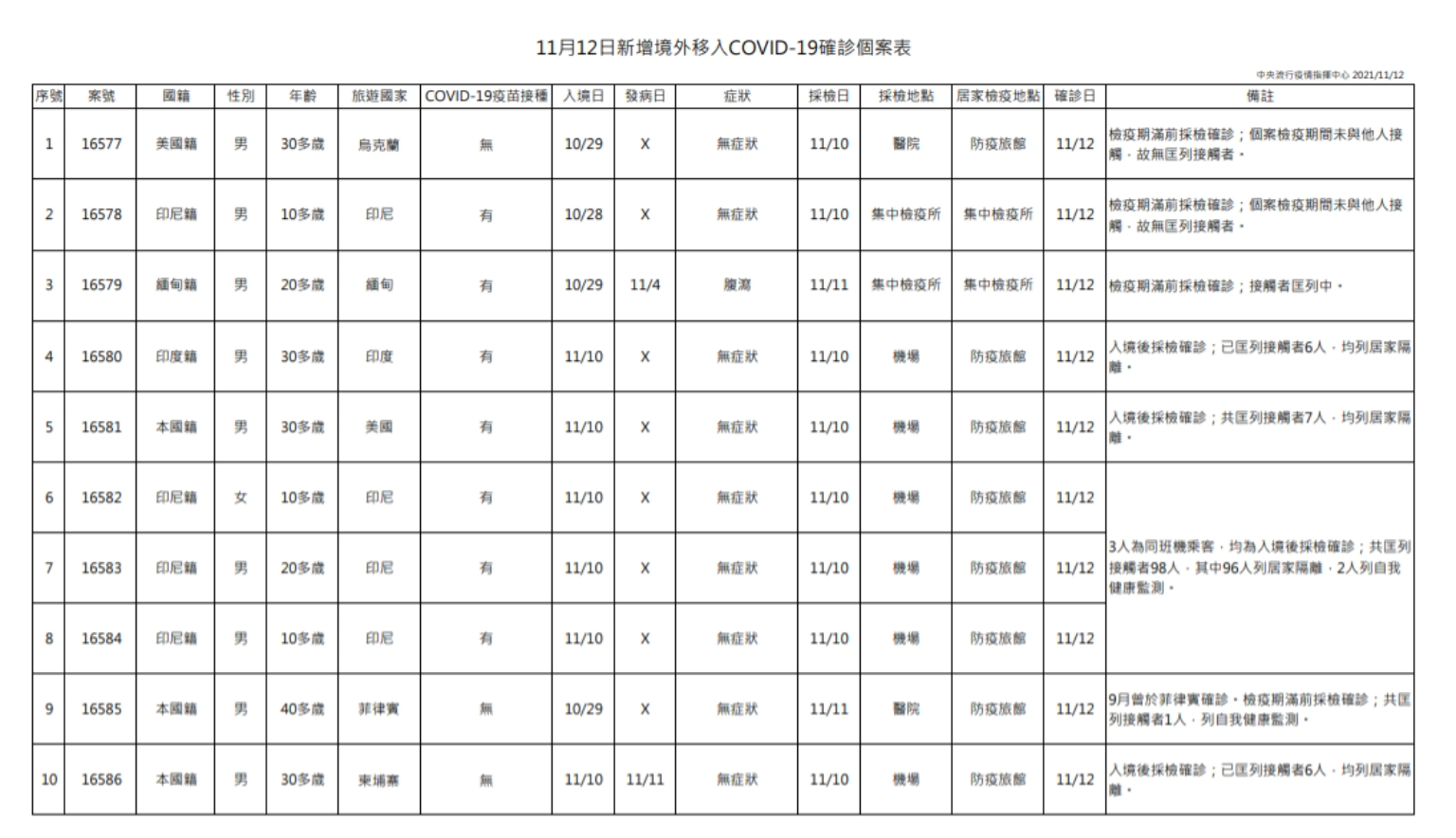 指揮中心指揮官陳時中說明,今日新增10例境外移入個案,為9例男性、1例女性,年齡介於10多歲至40多歲,分別自烏克蘭(案16577)、印尼(4例,案16578、16582-16584)、緬甸(案16579)、印度(案16580)、美國(案16581)、菲律賓(案16585)及柬埔寨(案16586)入境,入境日介於今(2021)年10月28日至11月10日,皆持有搭機前3日內檢驗陰性報告;詳如新聞稿附件。