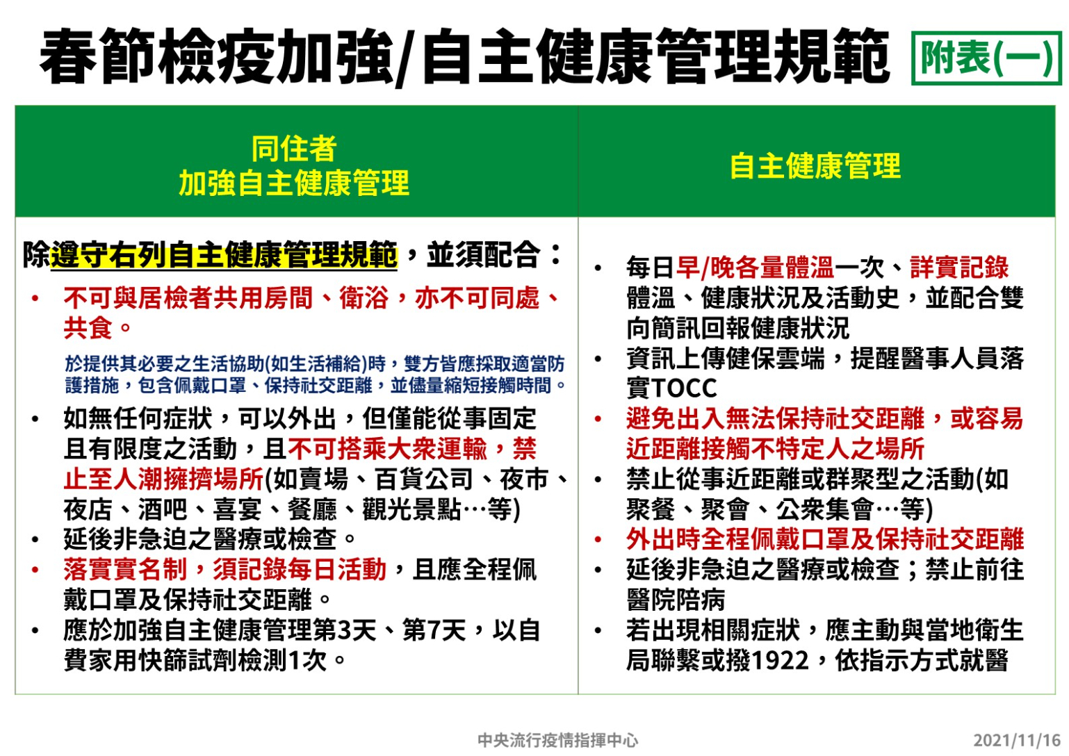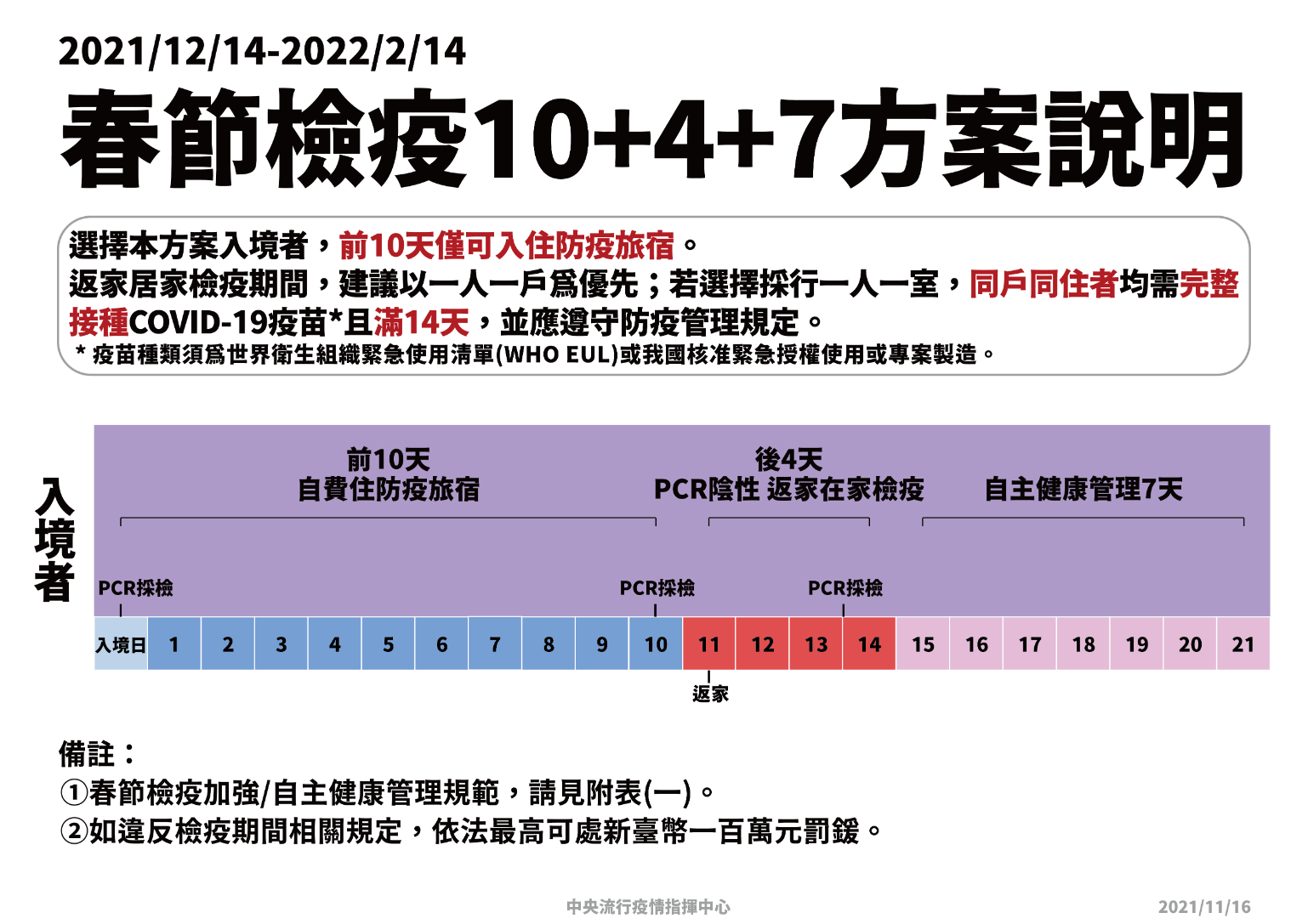因應春節返鄉潮,疫情指揮中心推出入境後三種居家檢疫模式,居檢天數加自主健康管理天數選擇「14+0+7」的,僅能入住集中檢疫所;選擇「10+4+7」的,前10天僅可入住防疫旅宿,返家居檢期間,以一人一戶為優先,若選擇一人一室,同住者均需完整接種COVID-19疫苗;選擇「7+7+7」的,入境者須完整接種疫苗且滿14天,並同樣要遵守一人一室時,同住者也要完整接種兩劑疫苗。
