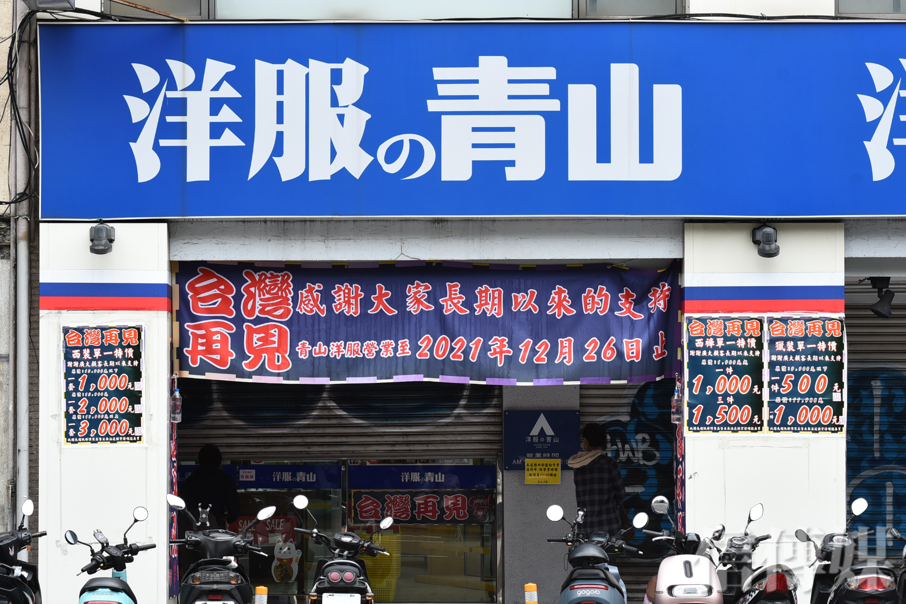 西裝連鎖品牌「青山洋服」(AOYAMA TALOR)在日本和台灣多處有分店,但疫情影響,許多分店結束營業,繼台中店之後、台北市東區服務18年的店家也關門,現在西門店、中山店也掛出告示指出,將在今年12月26日歇業。