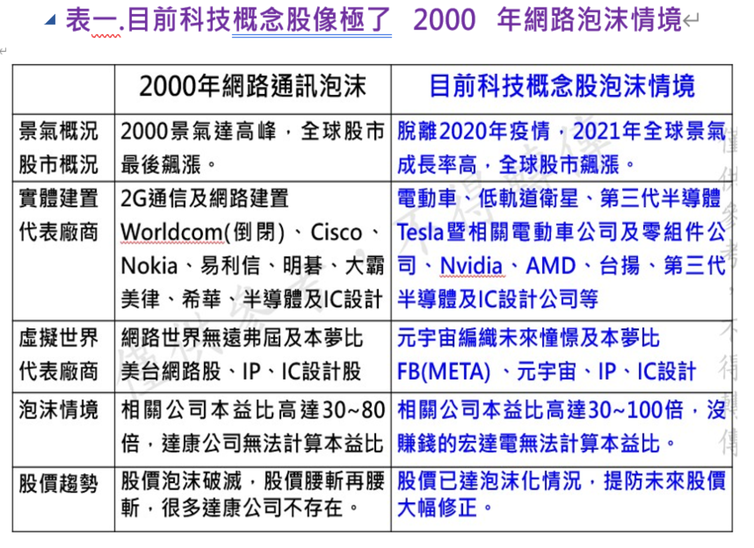 加以近期一大堆上市櫃科技公司也假託元宇宙的美好憧憬及畫大餅,分析師也開始以未來數年獲利來推薦目標價,大做本夢比行情的情況,像極了2000年網路泡沫情況。