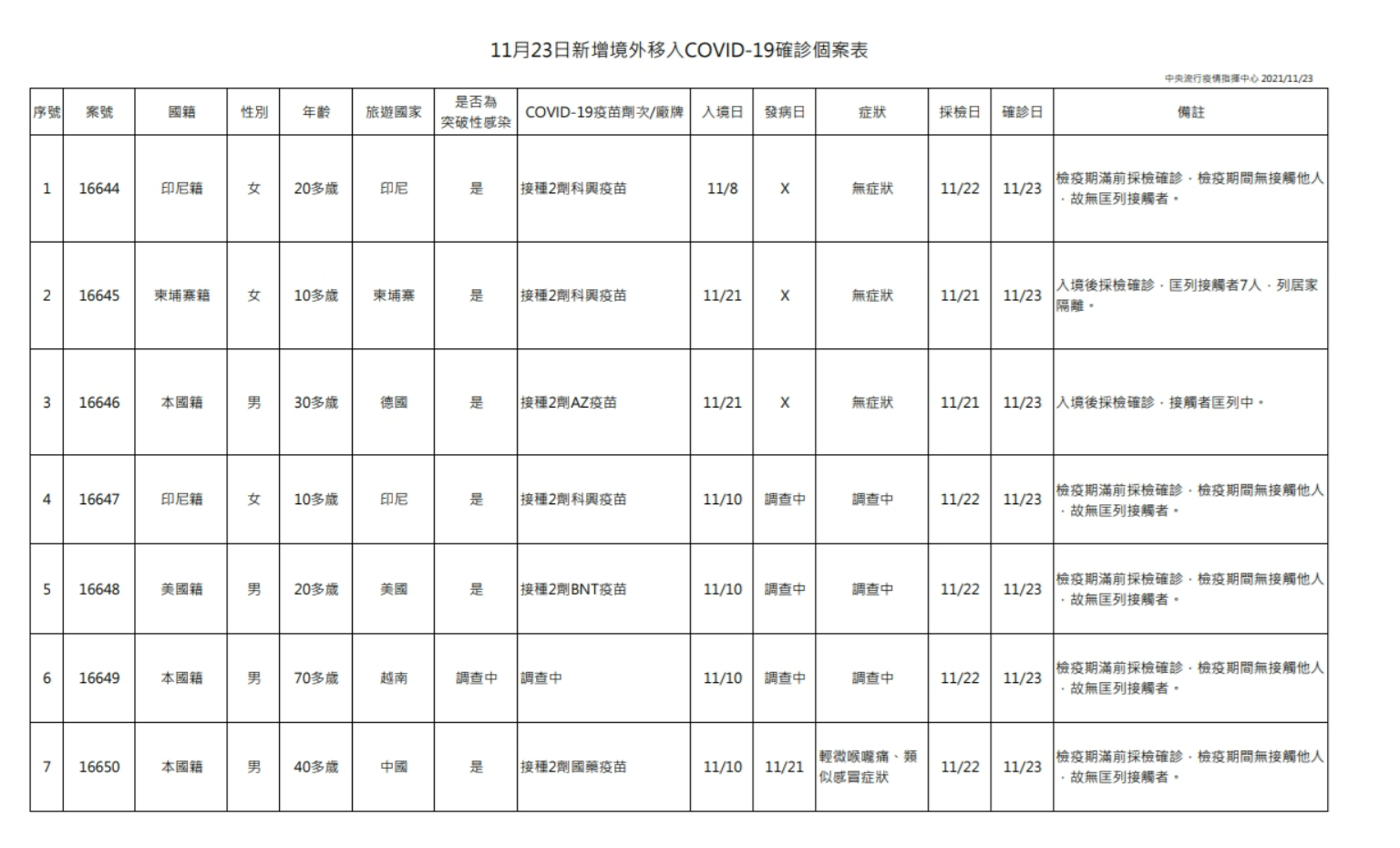 指揮中心指揮官陳時中說明,今日新增7例境外移入個案,為4例男性、3例女性,年齡介於10多歲至70多歲,分別自印尼(2例,案16644、案16647)、柬埔寨(案16645)、德國(案16646)、美國(案16648)、越南(案16649)、中國(案16650)入境,入境日介於今(2021)年11月8日至11月21日,皆持有搭機前3日內檢驗陰性報告;詳如新聞稿附件。