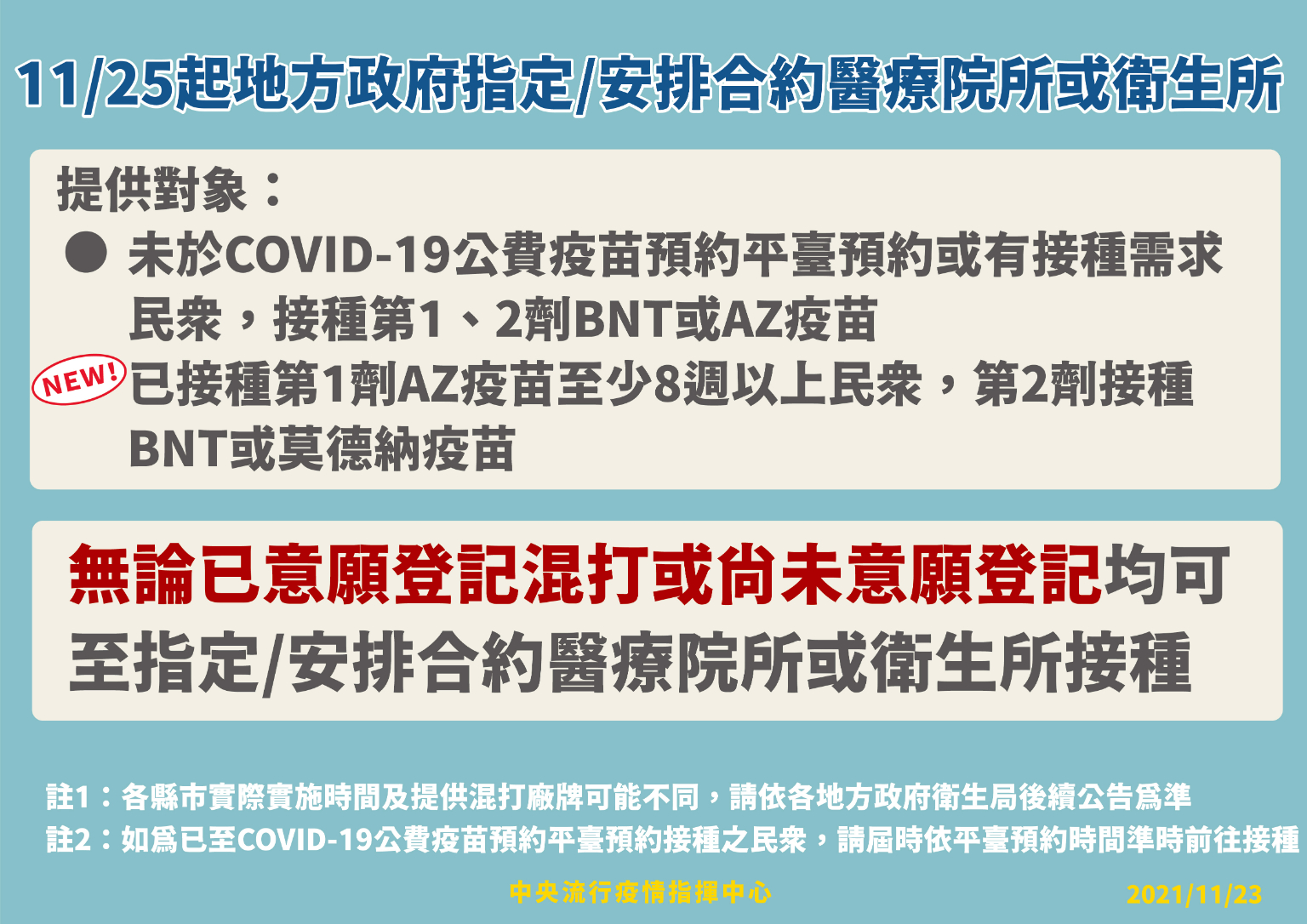 中央流行疫情指揮中心今(23)日表示,為利COVID-19疫苗有效運用並加速民眾完成接種,自「COVID-19公費疫苗預約平臺」第15期開打日(11月25日)起,開放各地方政府衛生局指定/安排合約醫療院所或衛生所,增加已接種第一劑AZ(AstraZeneca)疫苗接種間隔至少「8」週以上之民眾,第二劑接種BNT或莫德納(Moderna)疫苗;請有混打意願之民眾,無論是已意願登記混打或尚未意願登記,均可至指定/安排之合約醫療院所或衛生所接種,但各縣市實際實施時間及提供混打廠牌可能不同,請依各地方政府衛生局後續公告為準。如已至「COVID-19公費疫苗預約平臺」預約接種之民眾,請屆時依平臺預約時間準時前往接種。