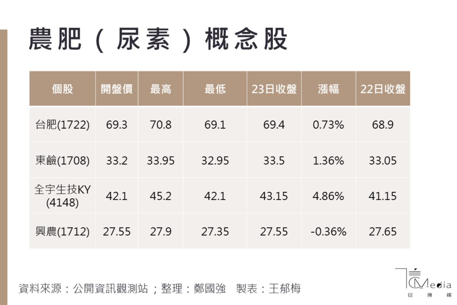 中國宣布及將禁止尿素原料出口,引起原料市場價格大幅波動,《日經亞洲評論》報導揭露韓國面臨經濟活動斷鏈危險,國內最大尿素進口商諾瓦材料科技董事長楊聯智對《信傳媒》表示,韓國政府組成緊急應變小組赴中談判,台灣也將面臨斷或危機,近日法人也持續買進台肥、東鹼、興農等,全宇生技-KY更大漲4.86%。