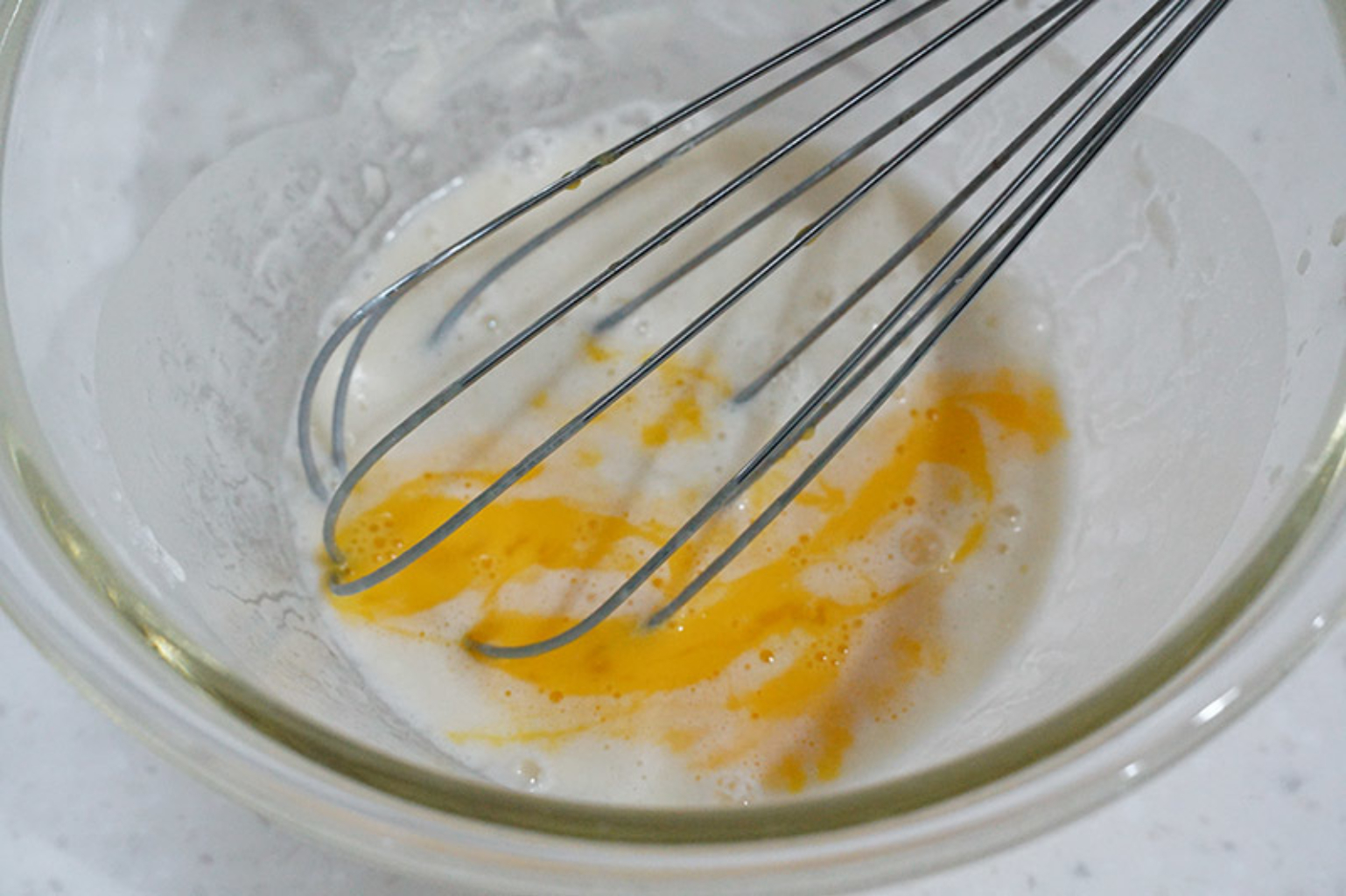將兩顆雞蛋打散,加入1~2湯匙蛋汁、蔥花跟1小匙鹽巴到麵糊,攪拌均勻。