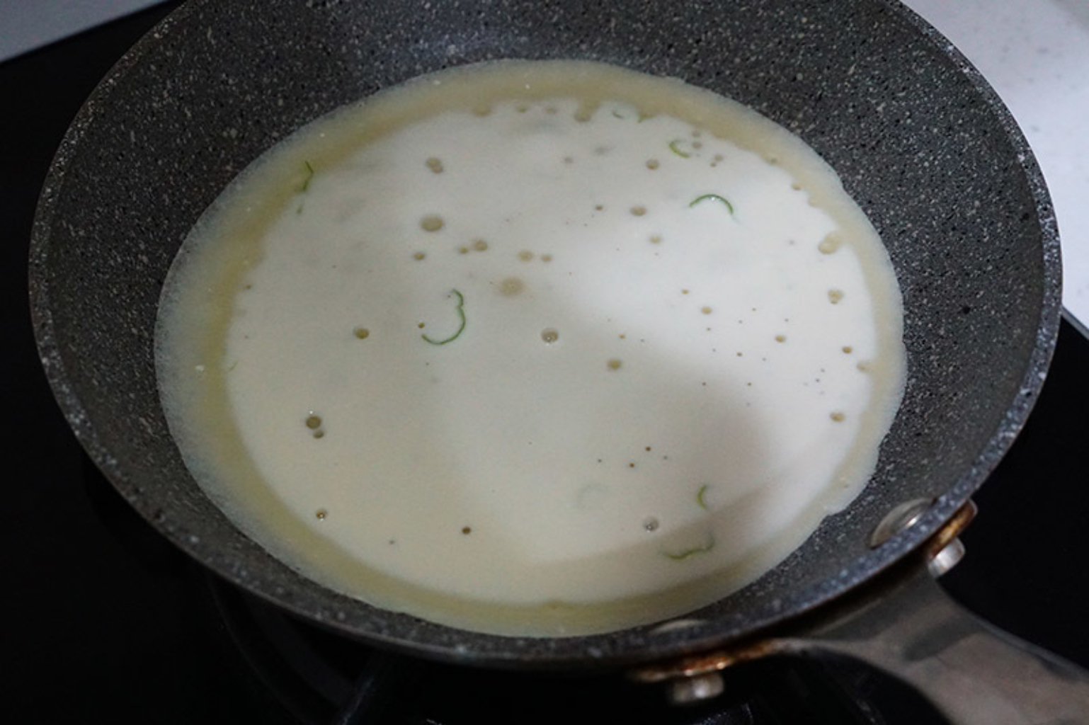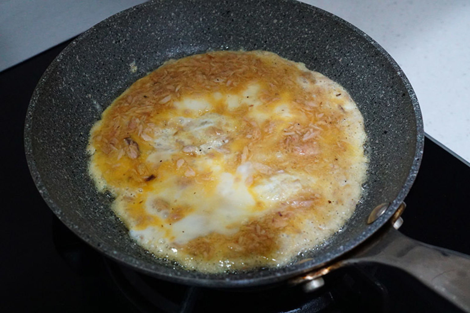 使用剛剛煎蛋餅皮的鍋子,再加入鮪魚蛋汁煎,過程保持大約中火或中小火。