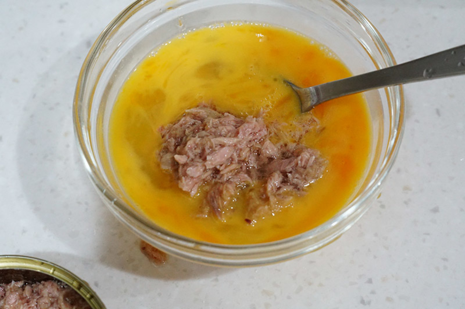 將剛剛已經拌勻的蛋汁(還記得剛剛做麵糊有用到1~2匙蛋汁喔),再加入鮪魚拌勻。