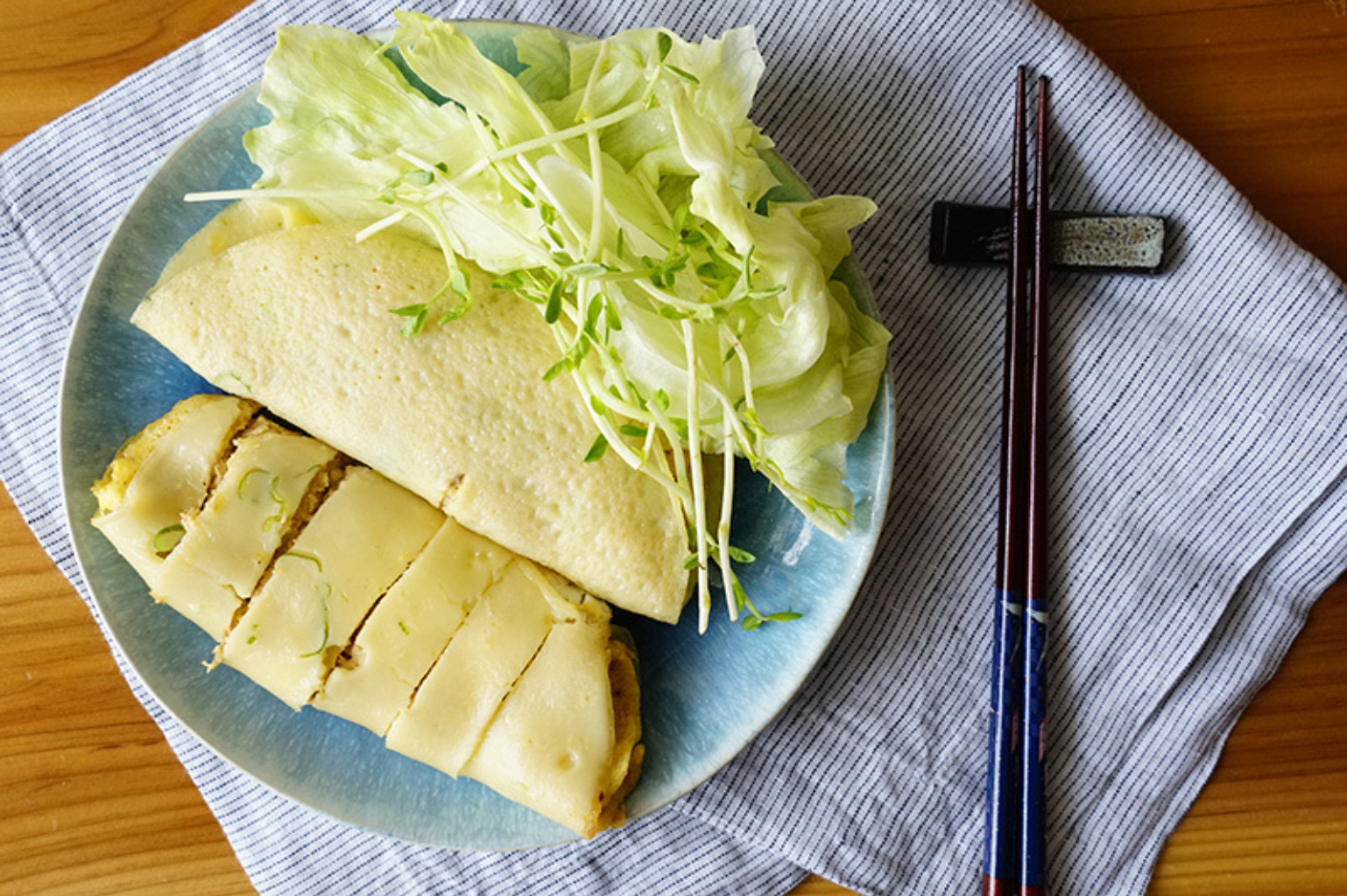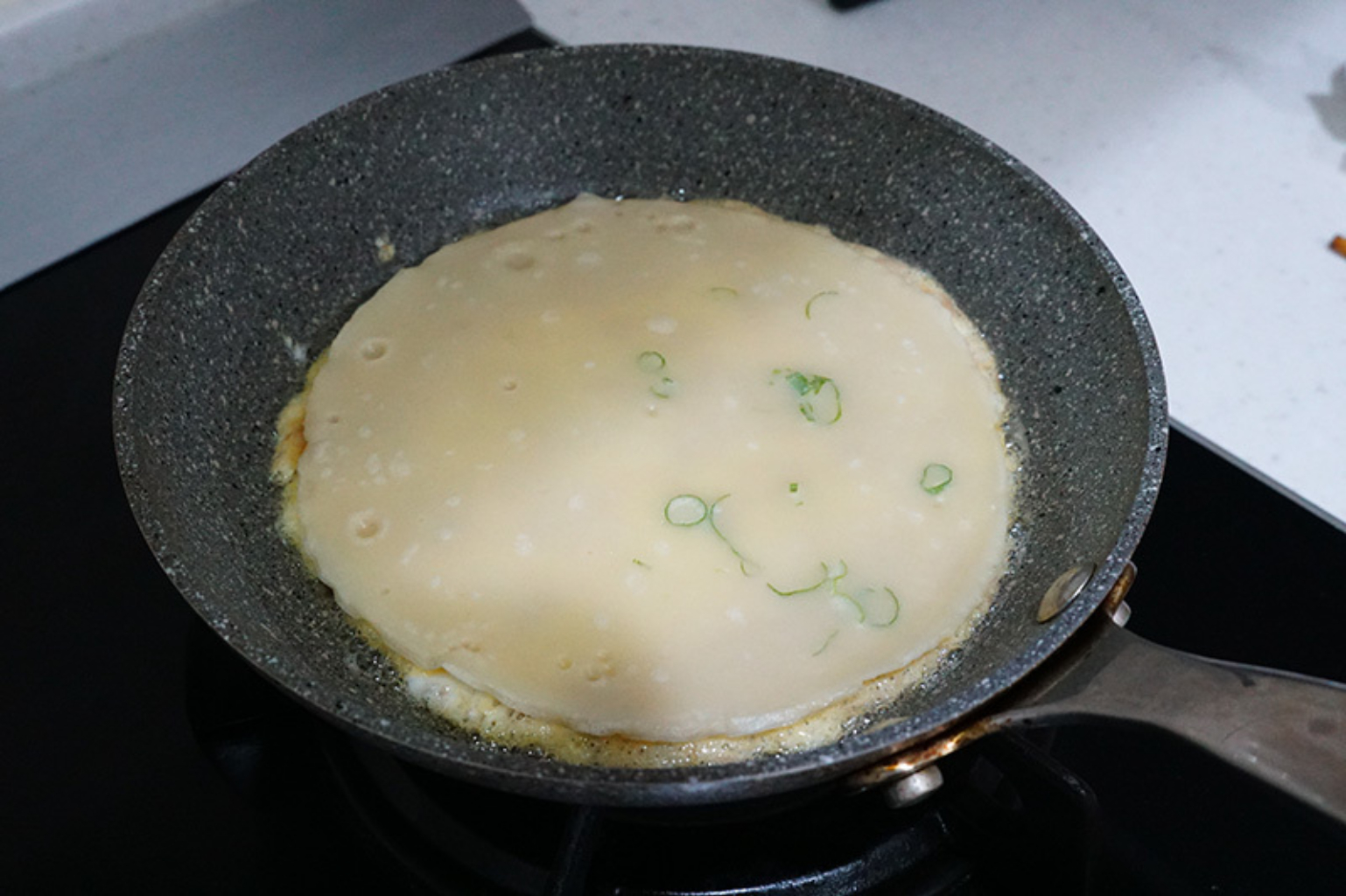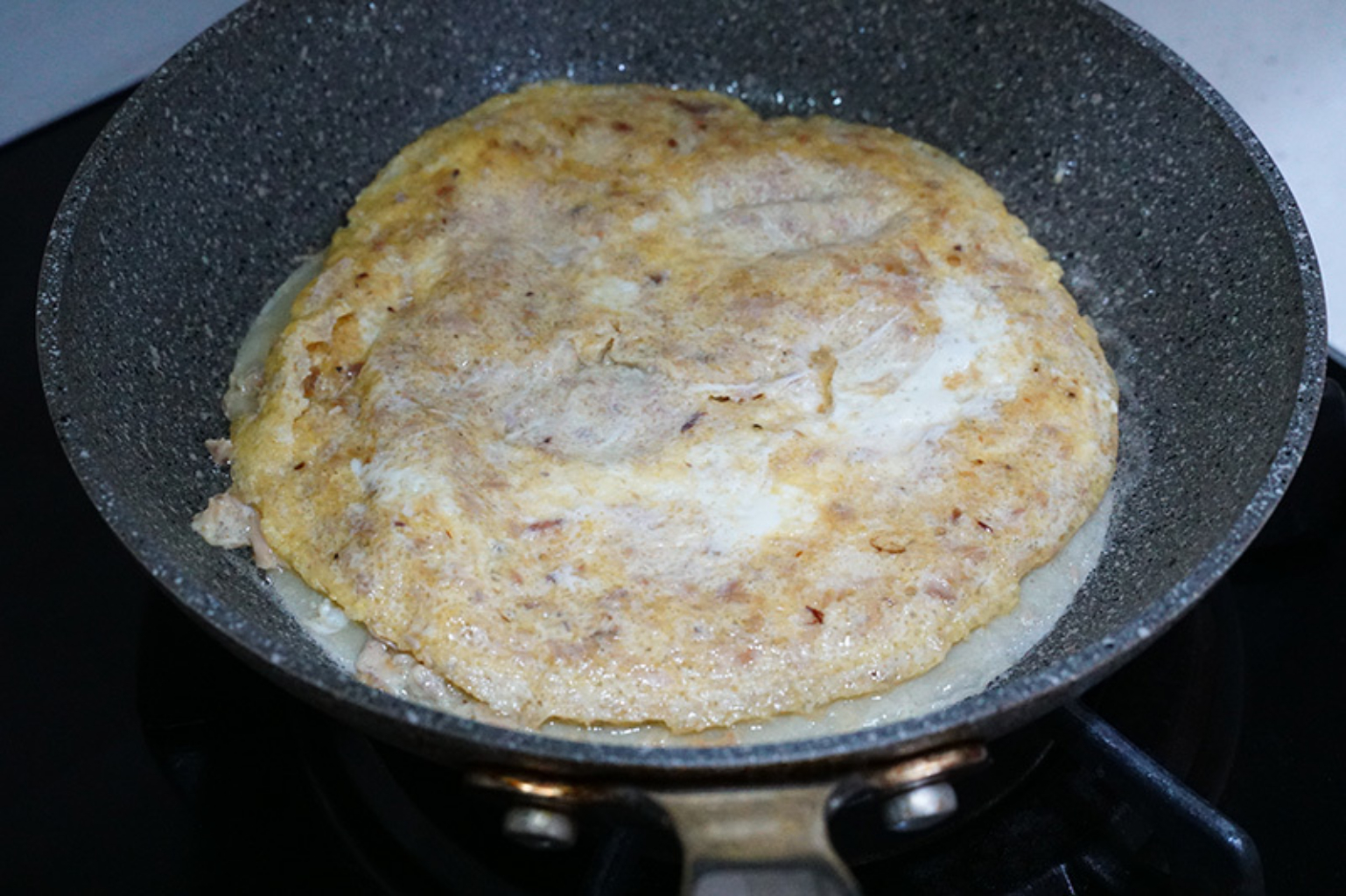 感覺鮪魚蛋大至凝固,就可以蓋上剛剛完成備用的蛋餅皮。