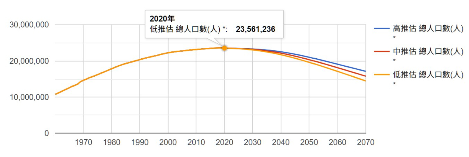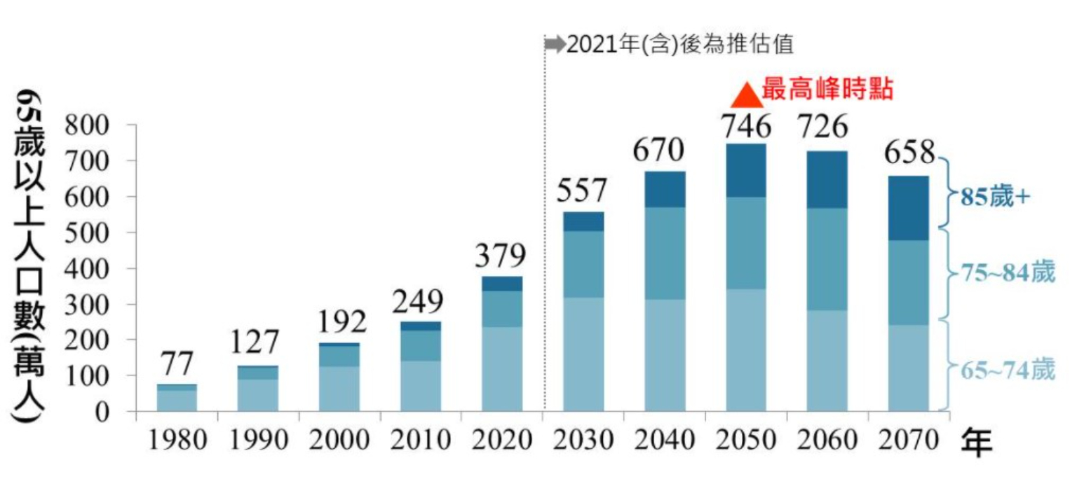 依照國發會最新預測,認為2025年老年人口將達到469萬,超過總人口數20%,正式邁入超高齡社會,也較2018年時的預測提前一年。與此同時,14歲以下人口則持續下探,去年仍佔12%、共296萬人,2050年將只剩約9%、189萬人,顯示我國老化速度飛快。