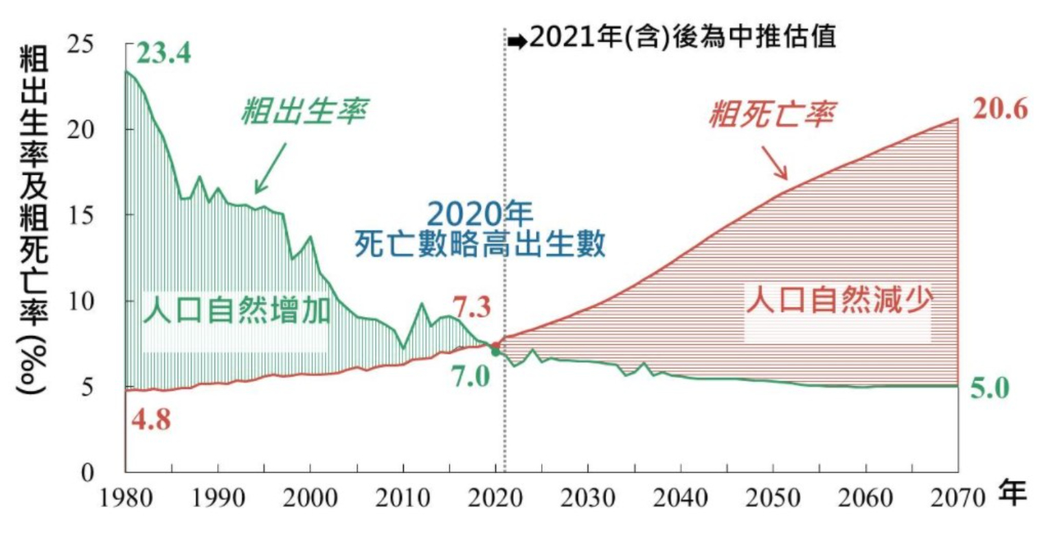 台灣在2020年出現人口「生死交叉」,死亡人數超越新生兒人數,正式進入人口負成長。今年10月底人口數比去年10月底減少15萬2592人。