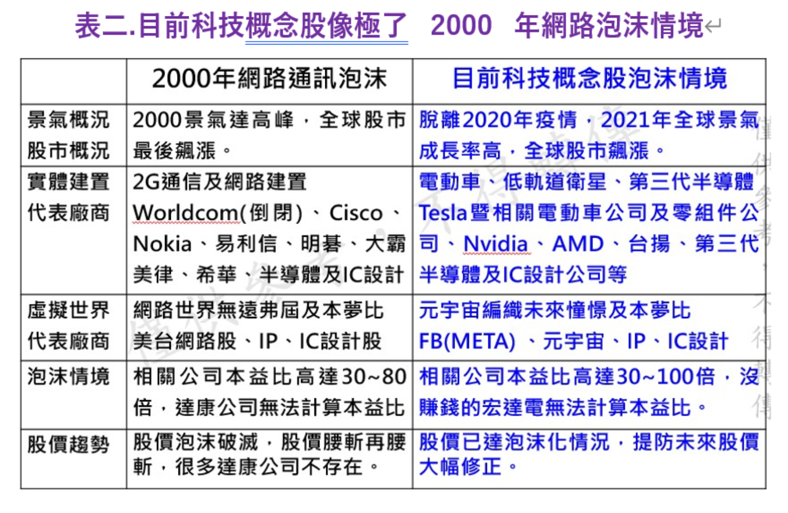 因為這波科技概念股的漲勢,不管是實體股票還是虛擬概念股,很像2000年網路通訊泡沫情境。2000年當時實體漲的是2G手機網路及通訊建置股,包含美國的通訊網路股如Worldcom(已倒閉)、Cisco、Nokia(全球最大手機廠,佔芬蘭股市3成市值)、易利信等公司;台灣則以明碁、大霸電子、美律、希華晶體、智邦、友訊等公司為代表,但是台美相關個股股價大漲完畢後就大跌修正,甚至大霸電子及Worldcom都已倒閉。